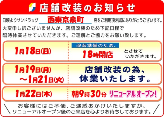 【通常営業時間9:30~21:30】1月19日(月)~1月21日(水)まで改装の為、お休みを頂いております。改装中は店舗受取のお引き取りができません。何卒ご了承下さいませ。