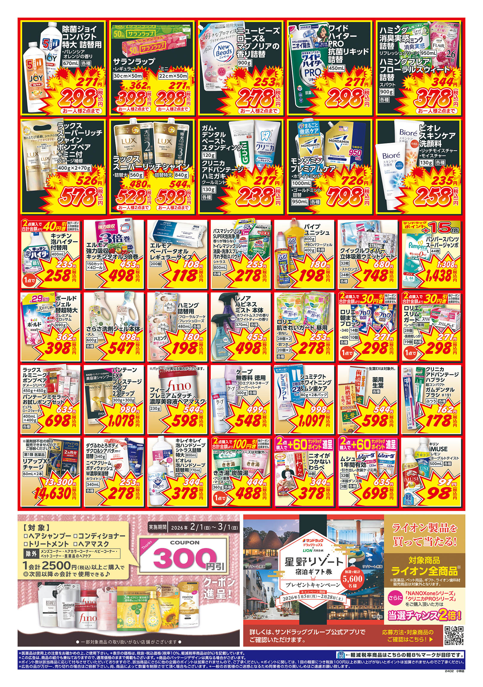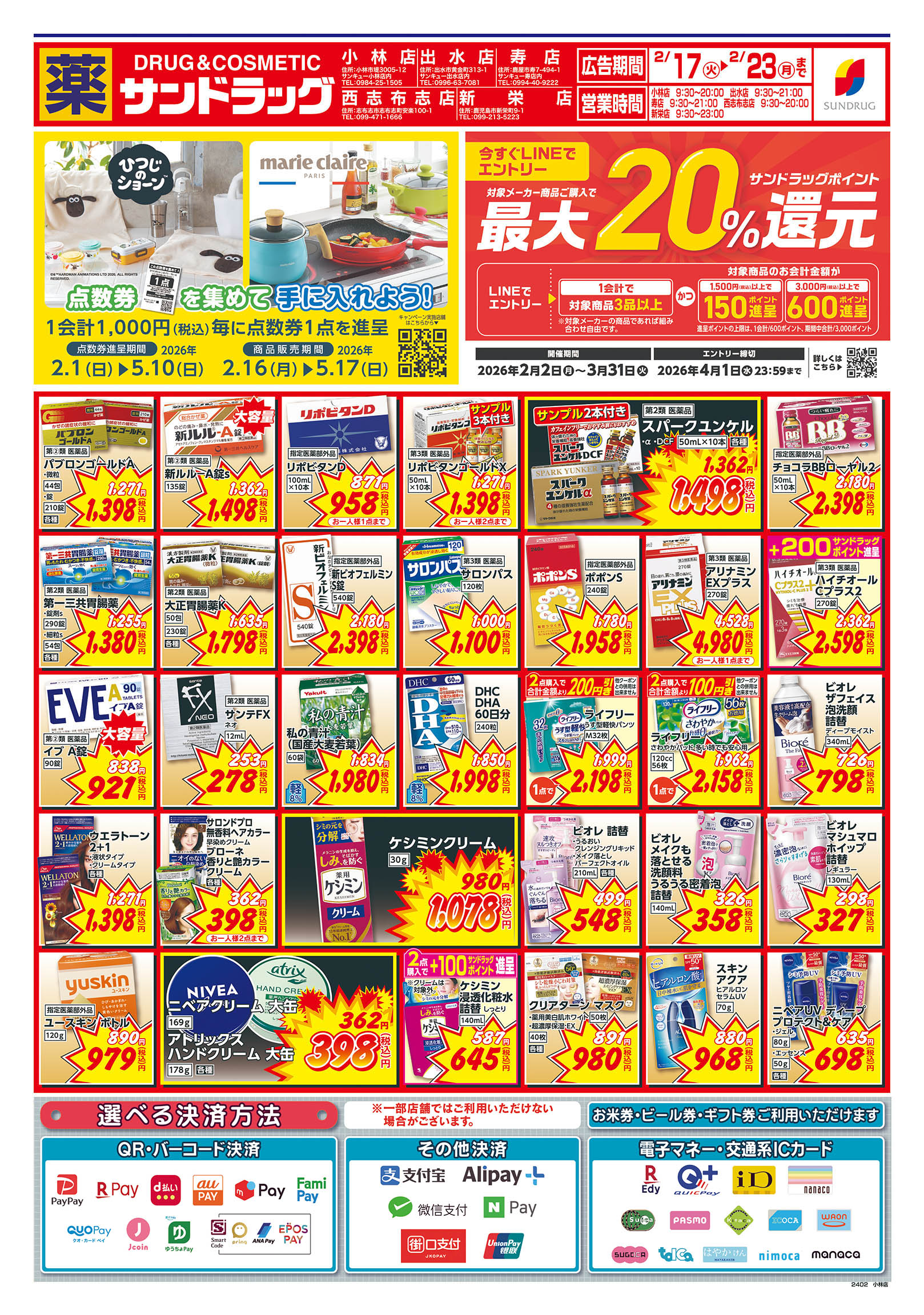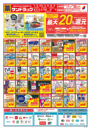 ・第一類医薬品は時間帯によって販売できない場合があります。 ・『駐車場設置店舗』には、 駐車券発行店舗も含まれます。 ・年末年始、または台風・大雪等の 気象条件により営業時間を変更 する場合がございます。 ・閉店前は店頭商品を店内に収納 する為、通路が狭くなる場合が ございます。