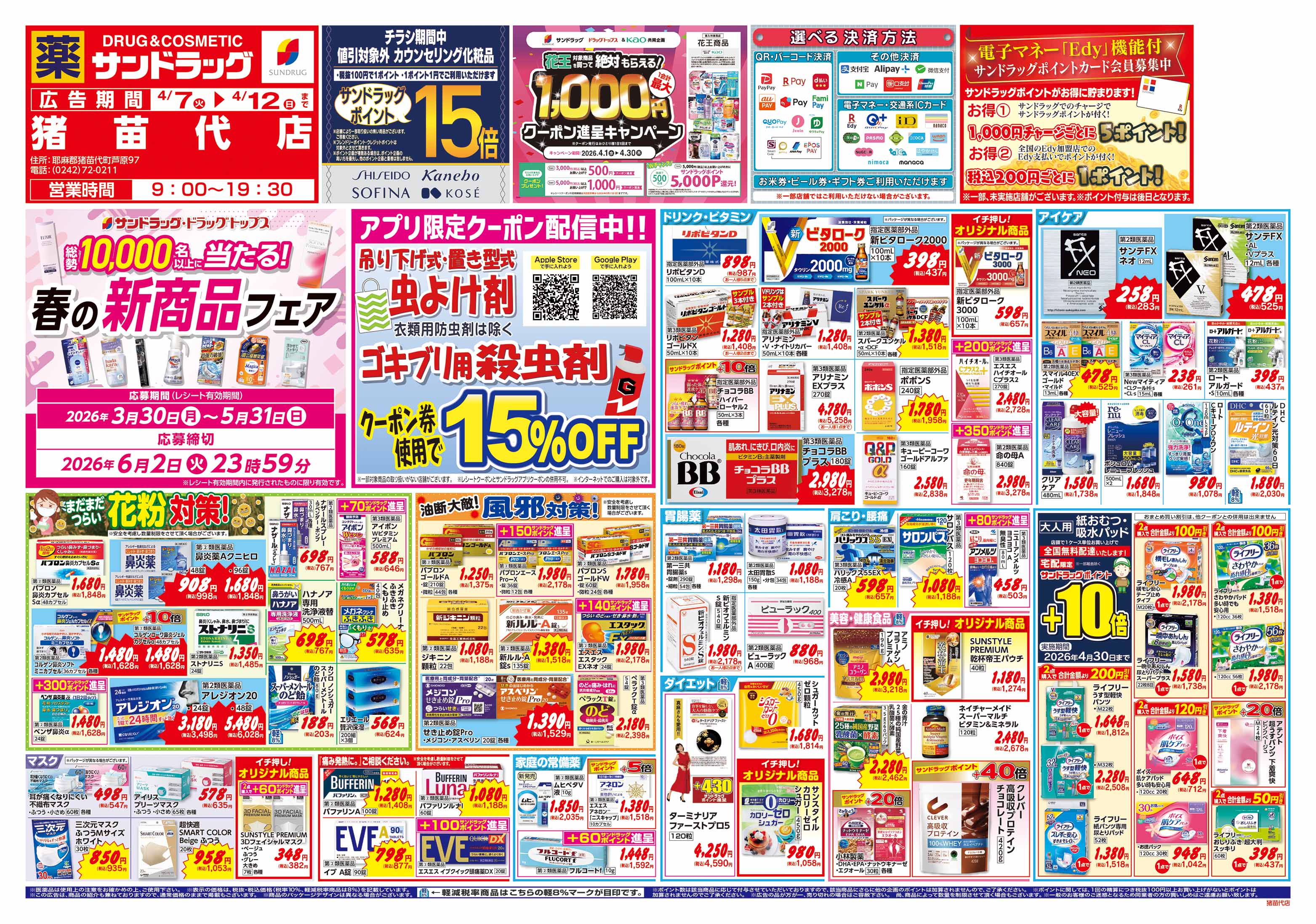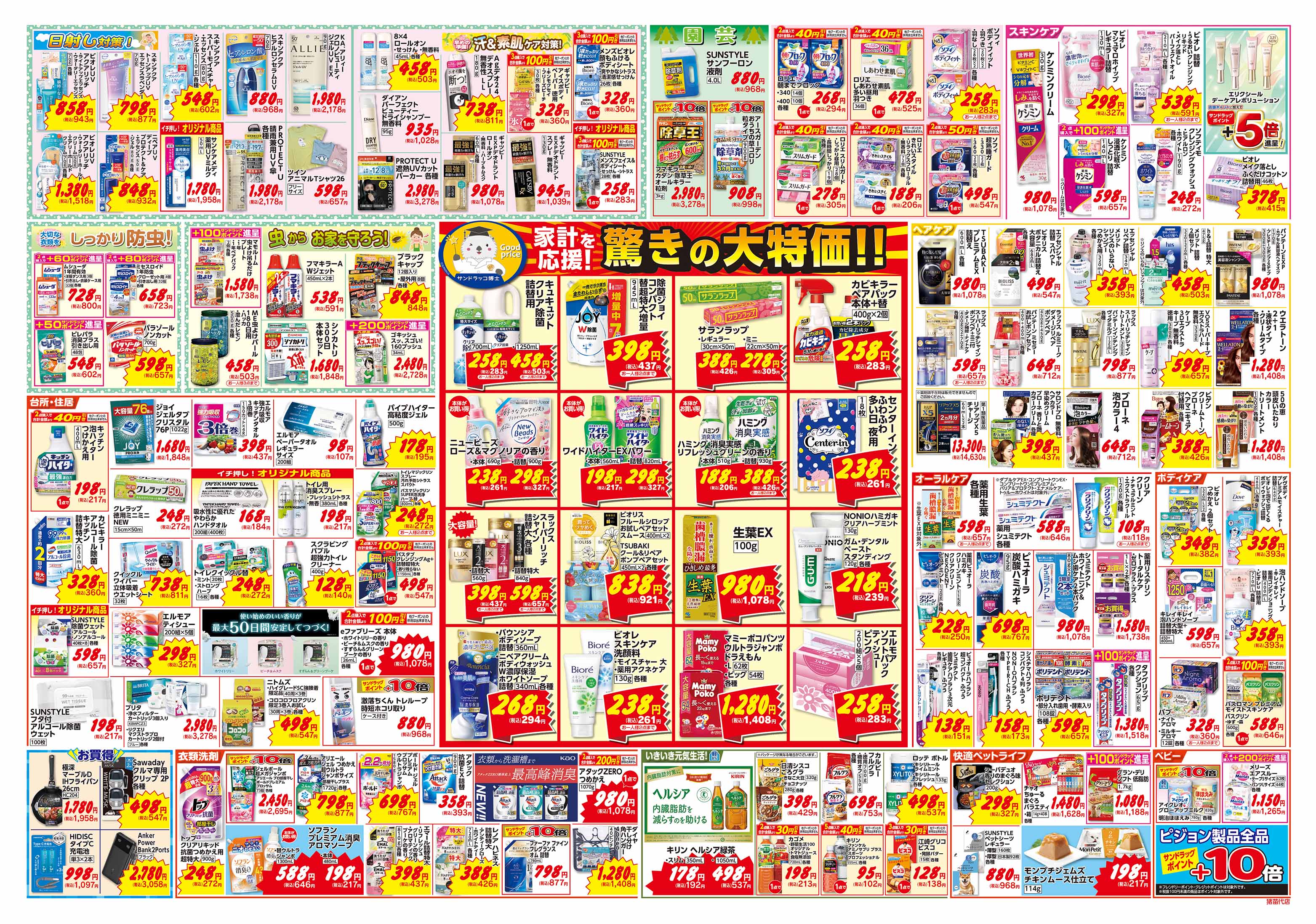 ・第一類医薬品は時間帯によって販売できない場合があります。 ・『駐車場設置店舗』には、 駐車券発行店舗も含まれます。 ・年末年始、または台風・大雪等の 気象条件により営業時間を変更 する場合がございます。 ・閉店前は店頭商品を店内に収納 する為、通路が狭くなる場合が ございます。