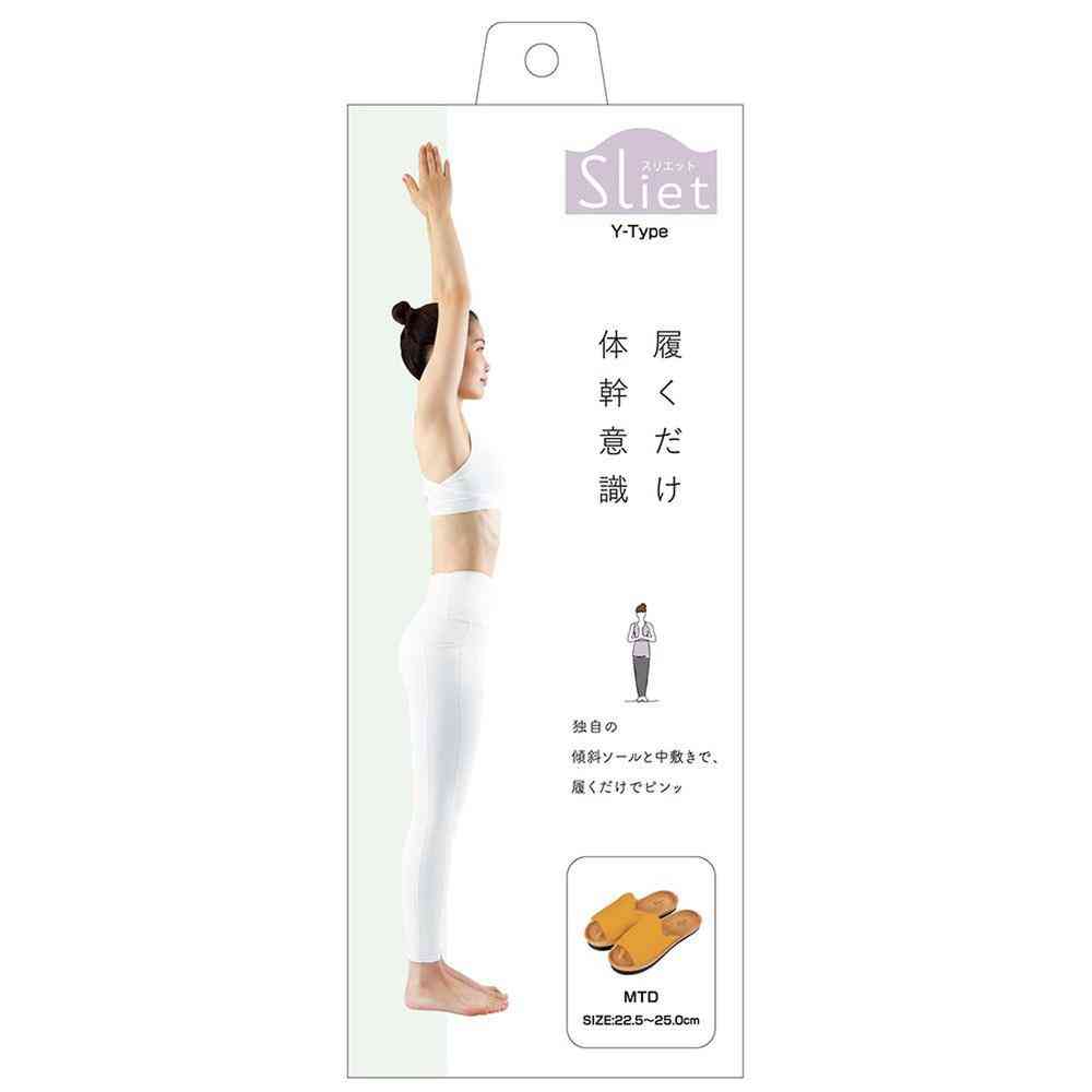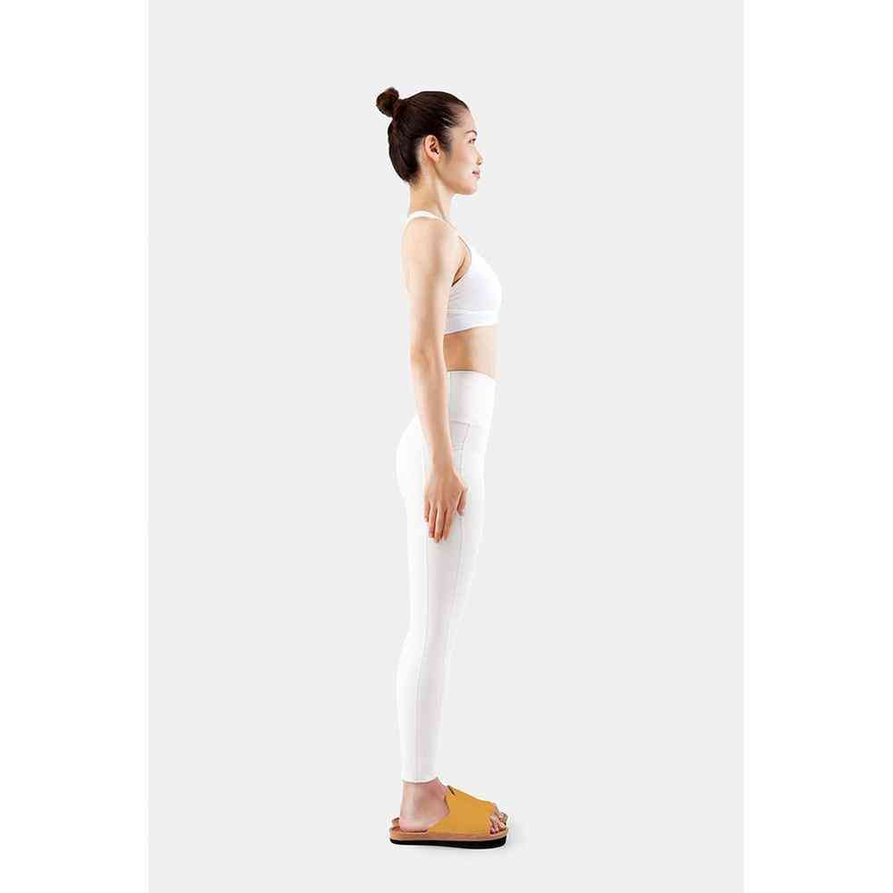 体の重心を後ろに意識させることで、下腹、ヒップ、ふくらはぎにキュッと力が入り体幹が鍛えられ体のラインを整えるスリッパです。