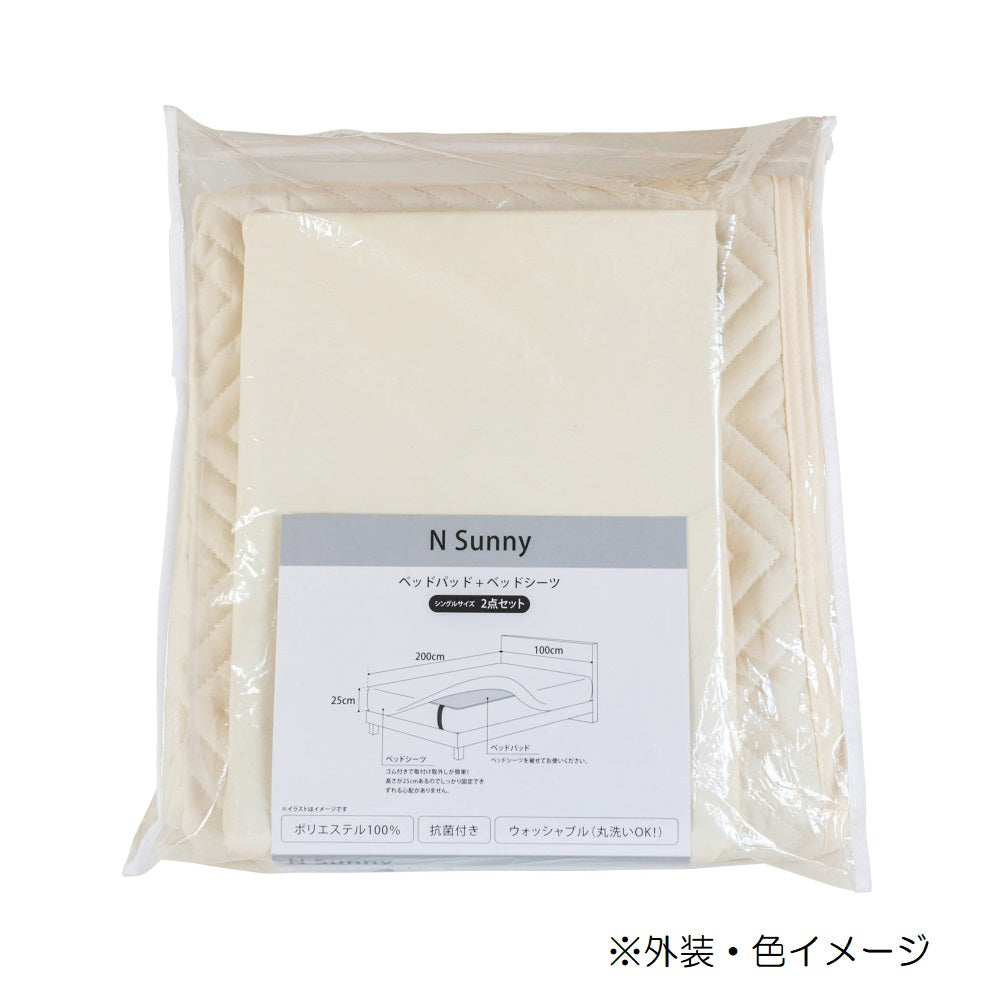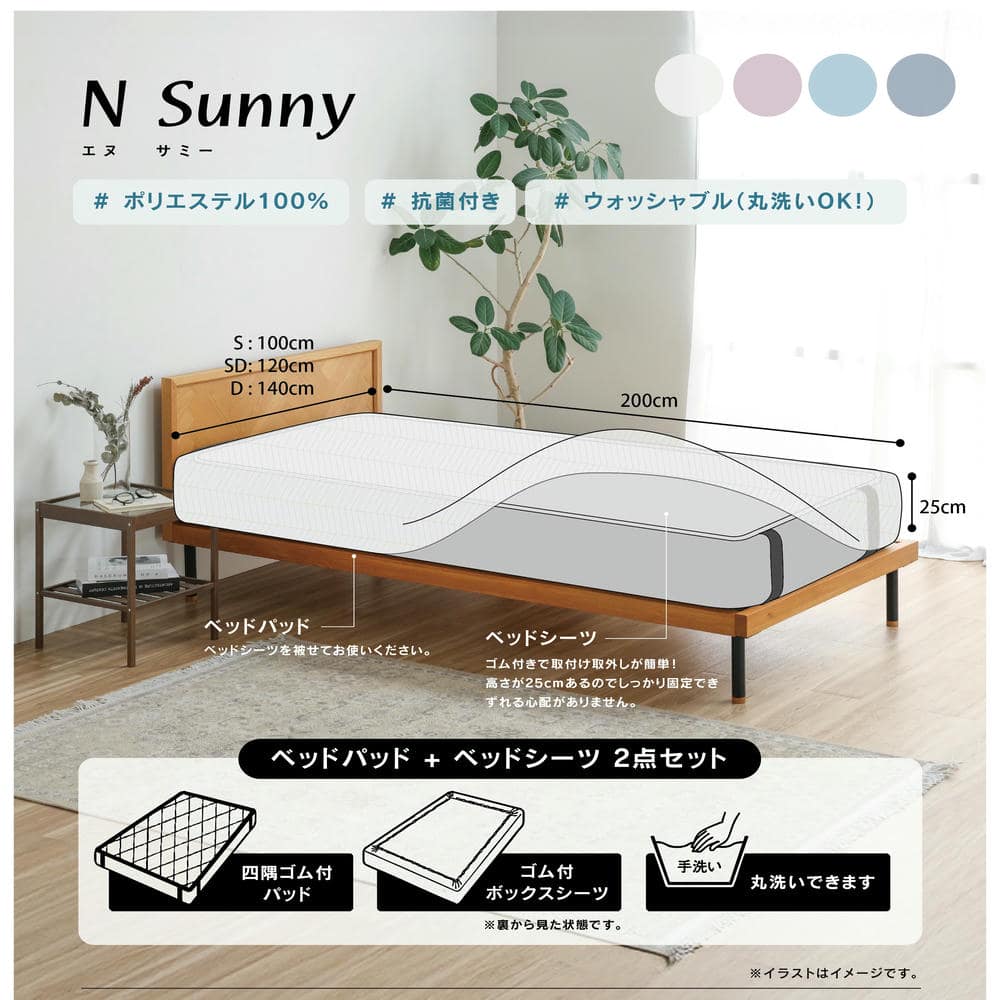 ベッドパッドとベッドシーツが1つになった商品。ベッドパッドは四隅に取り付け用のゴムが付いております。ベッドシーツはゴム付きのボックスシーツとなっており、ベッドパッドの上に被せてご使用ください。高さ25cmまで対応可能。手洗いによる丸洗いが可能です。