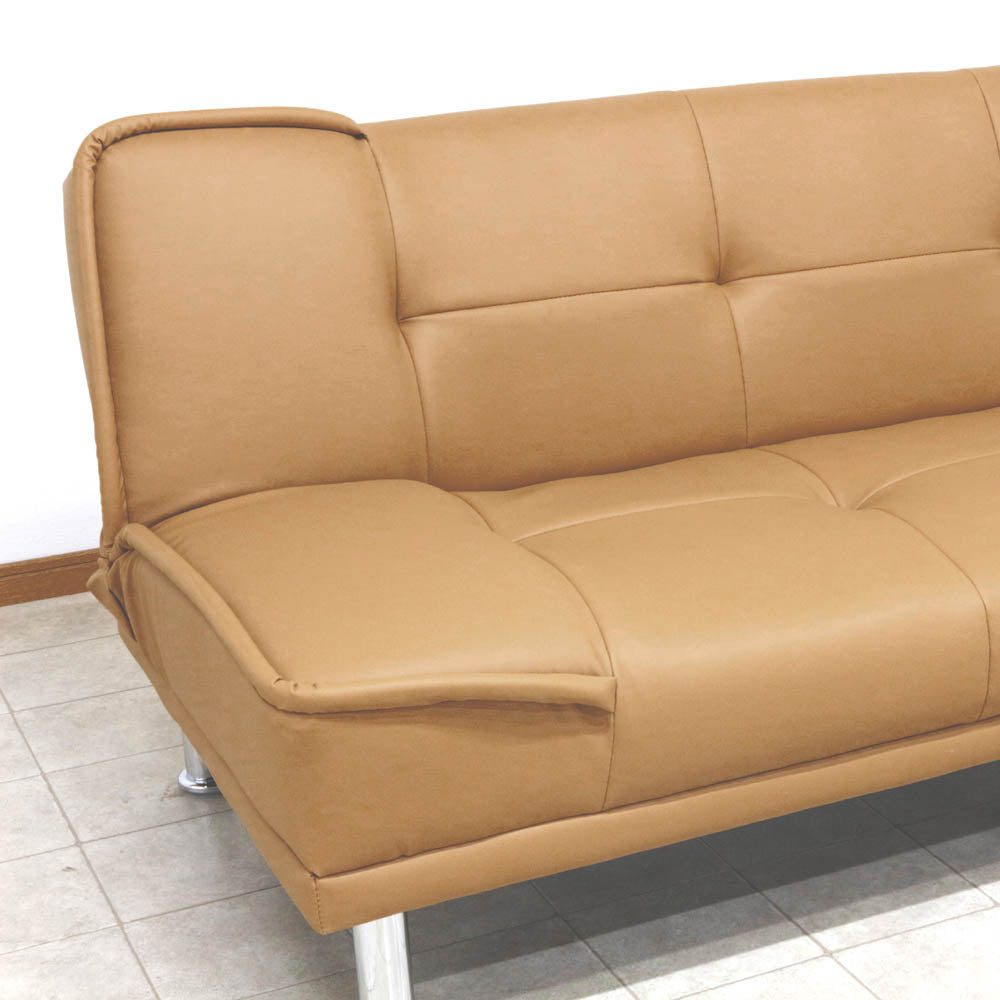 ●背もたれ部分は、3段階ギア仕様のソファーベッド。●生地はPVC生地でお手入れも楽々。●座面部分は、Sバネ+ウェービングベルトでしっかりサポート。●脚を外せばロータイプとしてもご利用可能。●脚高:18cm。●カラー:ライトブラウン色。●生産地:中国。