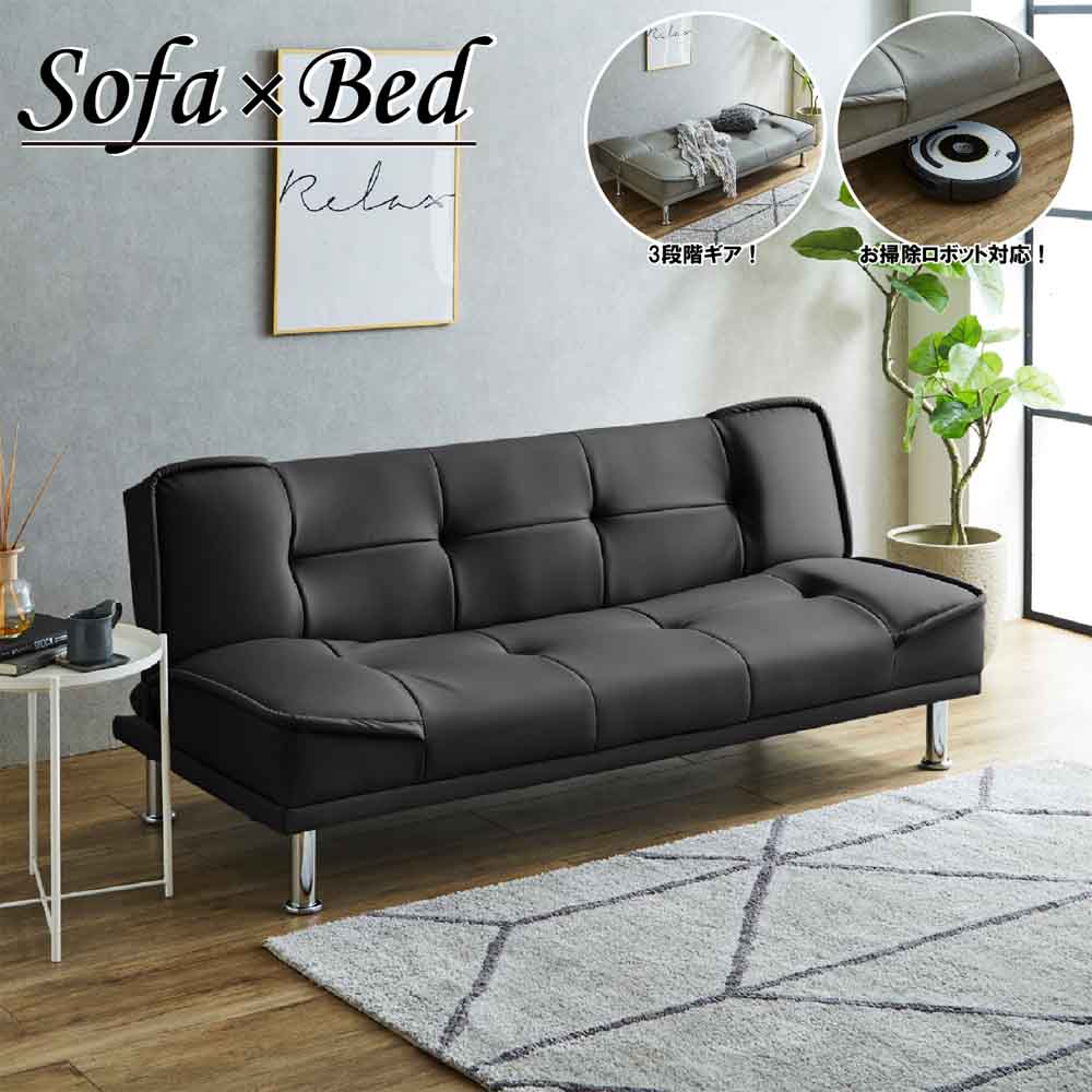 ●背もたれ部分は、3段階ギア仕様のソファーベッド。●生地はPVC生地でお手入れも楽々。●座面部分は、Sバネ+ウェービングベルトでしっかりサポート。●脚を外せばロータイプとしてもご利用可能。●脚高:18cm。●カラー:ブラック色。●生産地:中国。