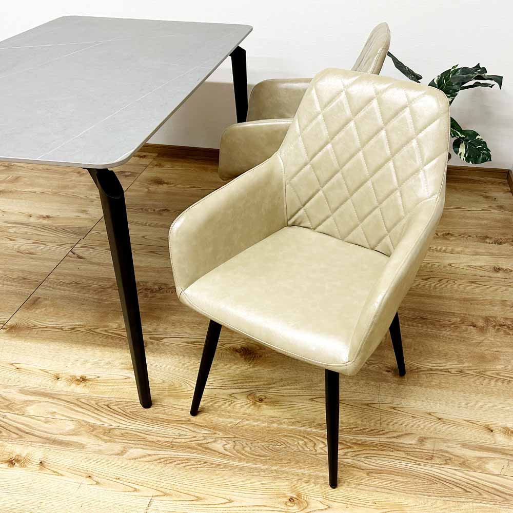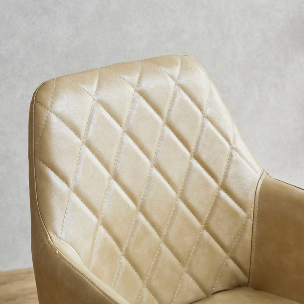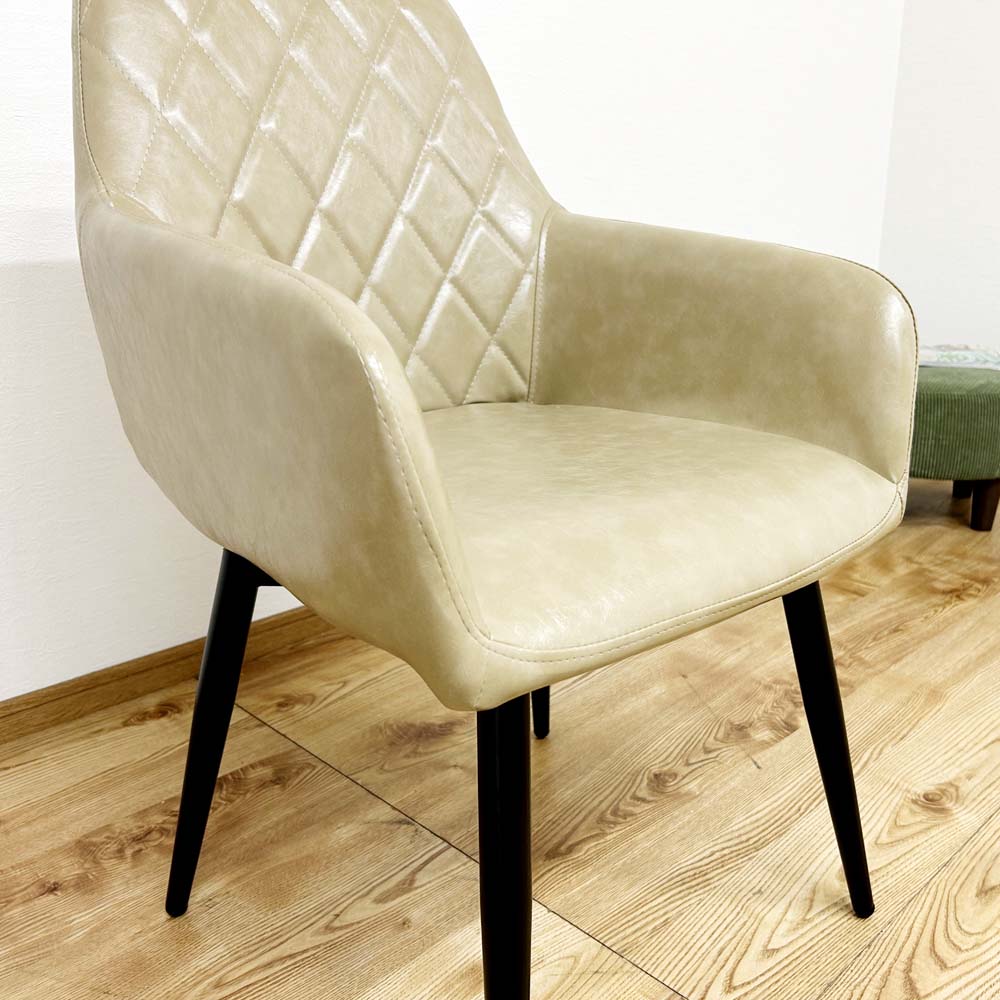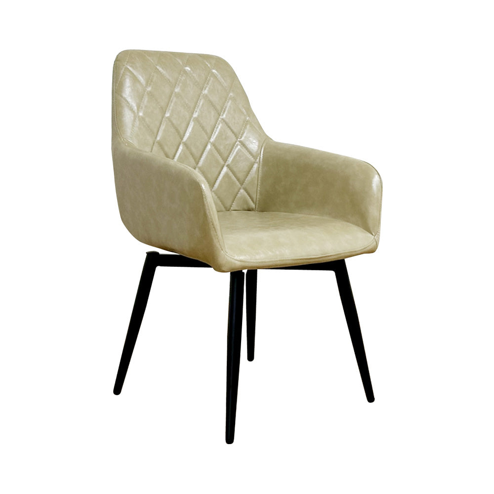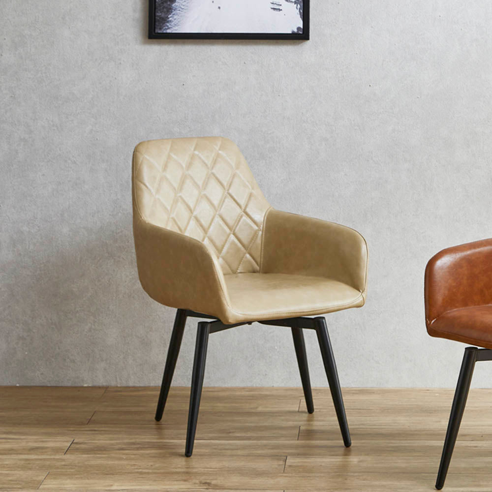 ●PU生地を採用したレトロ感漂うダイニングチェアー。●背もたれのクロスステッチが背もたれをしっかりサポートするダイニングチェアー。●脚はブラックスチール脚を採用したオシャレなデザイン。●チェアーは、360°回転式で立ち上がりを楽々サポート。●脚はアジャスター付きでガタツキ調整も可能。●カラー:クリーム色。●原産地:中国。