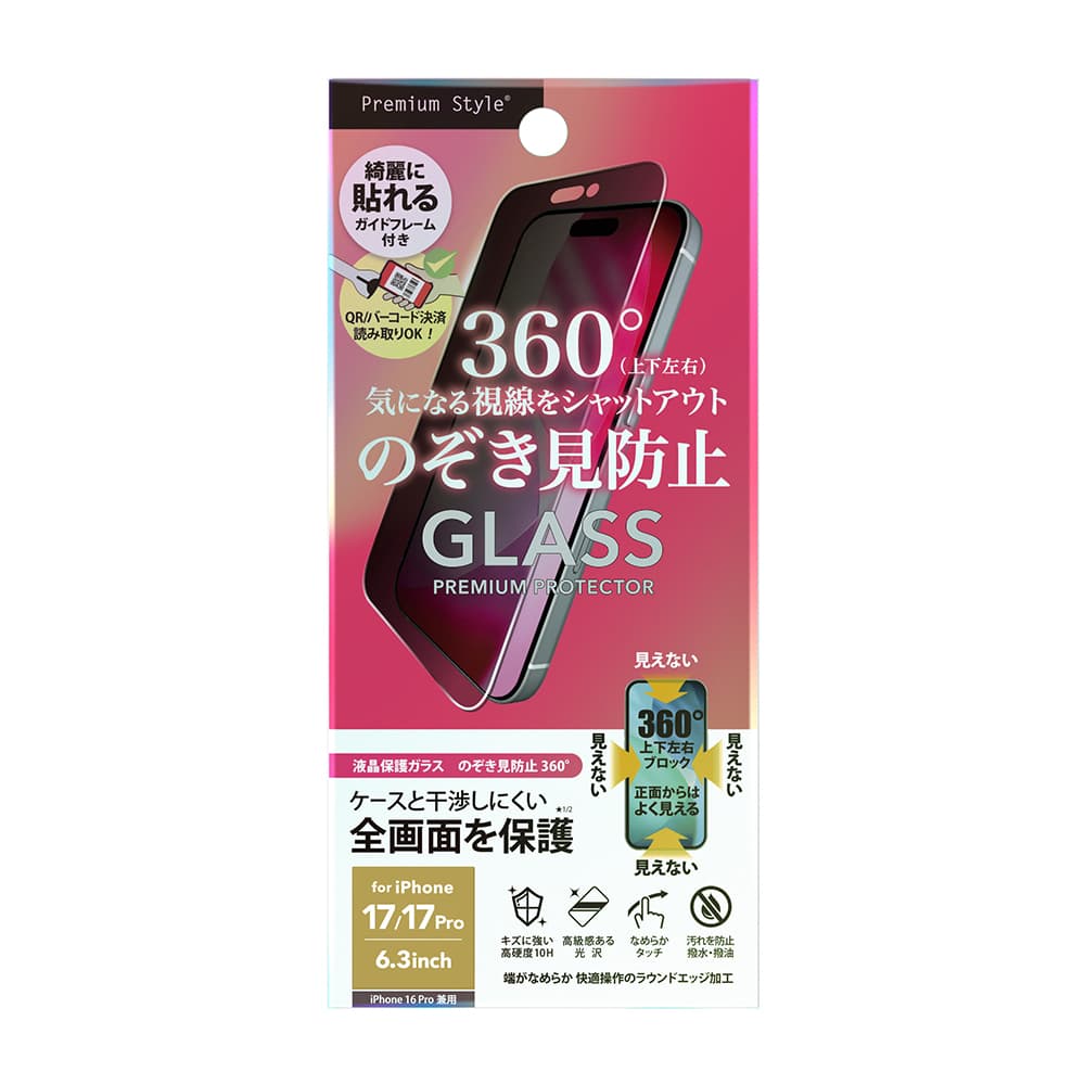 「PG-25AGL04MB」は、気になる視線を360°遮断するiPhone 17/17 Pro/16 Pro用 液晶全画面保護ガラス 360°のぞき見防止です。
