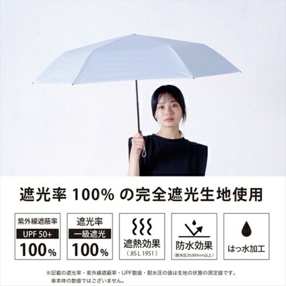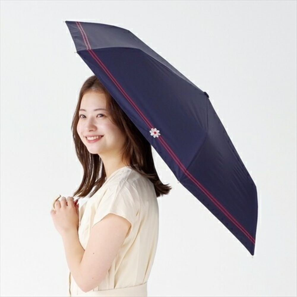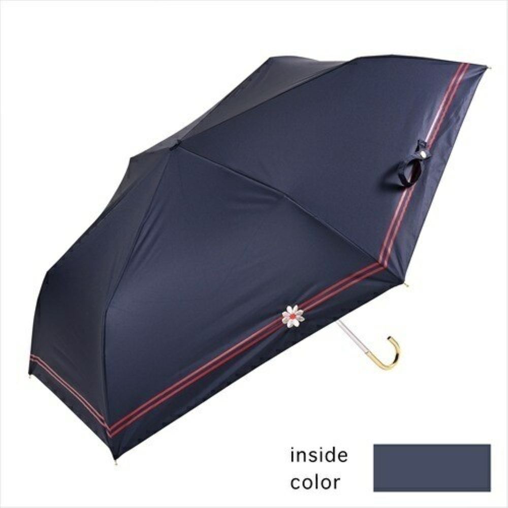 ポリエステル生地の裏側にポリウレタン加工を施した一級遮光生地の親骨50cm折りたたみ遮光晴雨兼用日傘です。紫外線遮蔽率100%、UPF50、遮光率100%、遮熱性効果で強い日差しや暑さをしっかり遮ります。雨の日にも安心なはっ水・防水効果もあり、耐水圧の検査も20000mm以上を計測していますので、晴雨兼用日傘としてオールシーズンお使いいただけます。折りたたみタイプはコンパクトになるので、使わない時にはバッグに収納でき携帯に便利です。指や爪をはさみにくい「安全ろくろ(ストッパー)」を使用しているので、ボタン部分を押して開閉でき安心してお使いいただけます。ハンドル部分は曲がりタイプですのでしっかり握れて安心です。ボーダープリントに花の刺繍を合わせたデザイン。ベースカラーによって花の刺繍のカラーも違います。