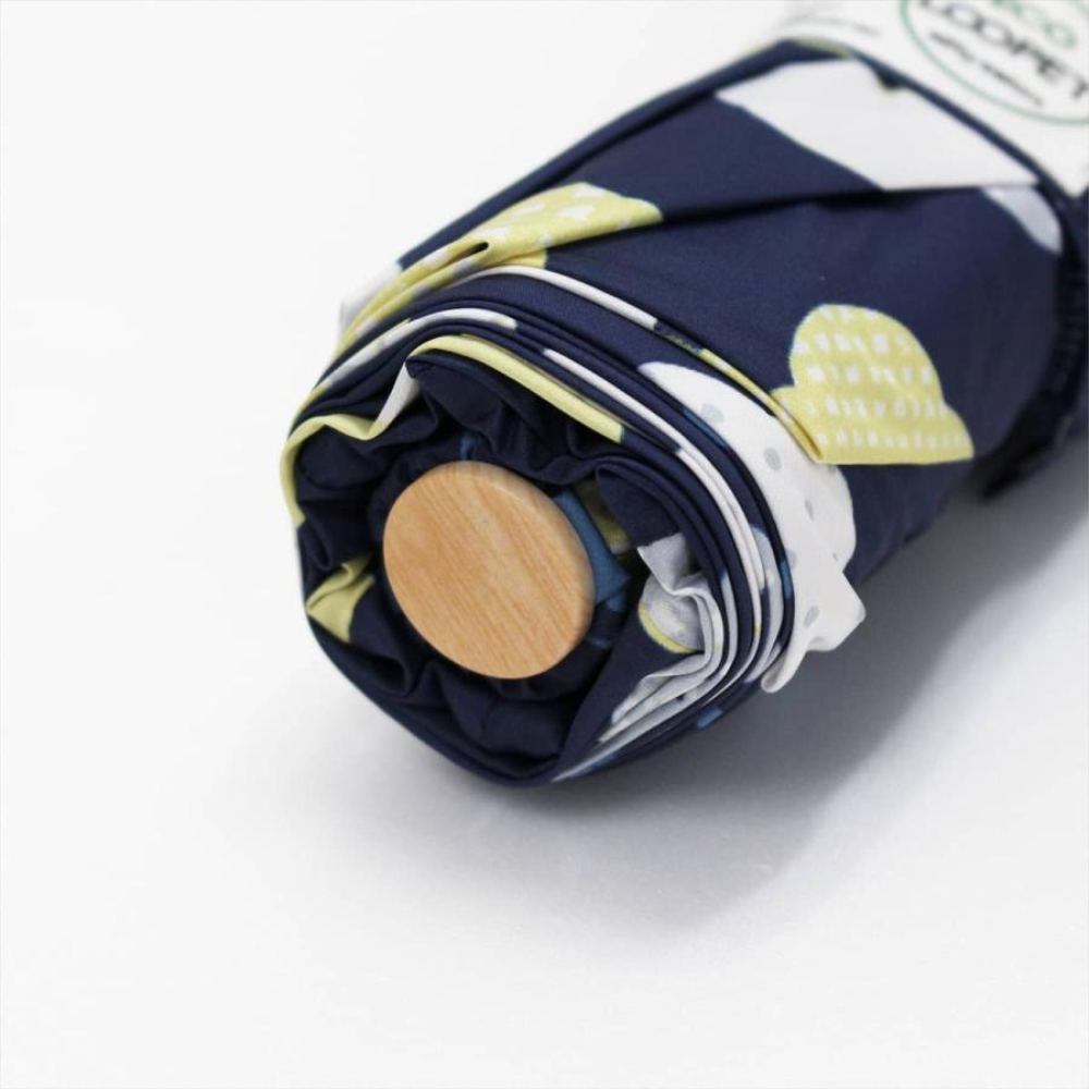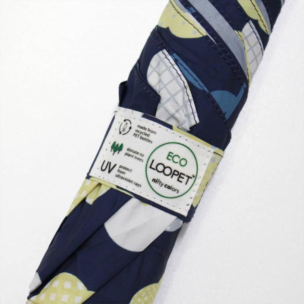 ネイビーの落ち着いたベース色に、イエローとグレーの可愛らしい花が広がります。シンプルな形の花にはチェックやドット模様が描かれ、さりげないアクセントになっています。ケースやベルト部分のブランドネームがモダンでスタイリッシュです。「LOOP=輪にする・つなぐ」と、「PET=ペットボトルの略」を組み合わせたエコルーペットは、廃棄されるペットボトルをリサイクルした生地を使用したサステナブル(=持続可能)ブランドです。 ハンドル部分のボタンをワンプッシュで自動に開閉する自動開閉傘なので、片手が塞がっている時や雨の日の車の乗降時に便利です。 手を離しても戻ることなくシャフトの伸縮が止まるので、安全に使うことが出来ます。 ハンドル部分の木目プリントが、ナチュラルな佇まいです。 親骨58cmサイズは、男性にも女性にも使いやすいサイズ感で、年齢性別問わずお使い頂けます。 紫外線防止加工を施しているので、遮蔽率が全色90%以上あり、「晴雨兼用傘」として雨の日も晴れの日もオールシーズンお使いいただけます。