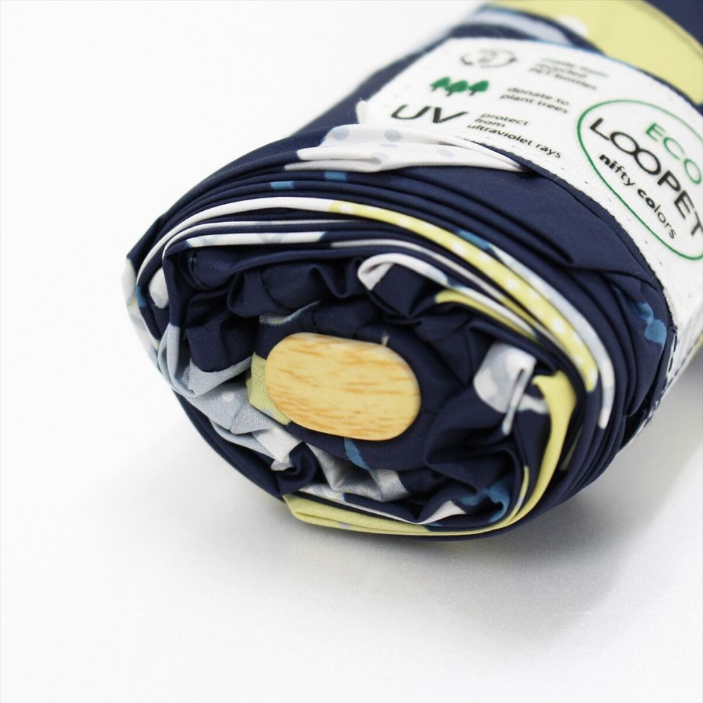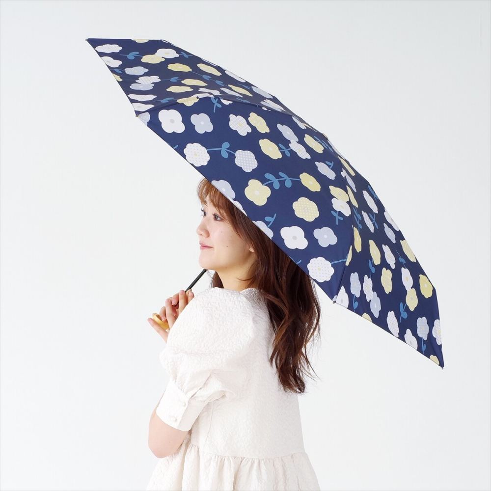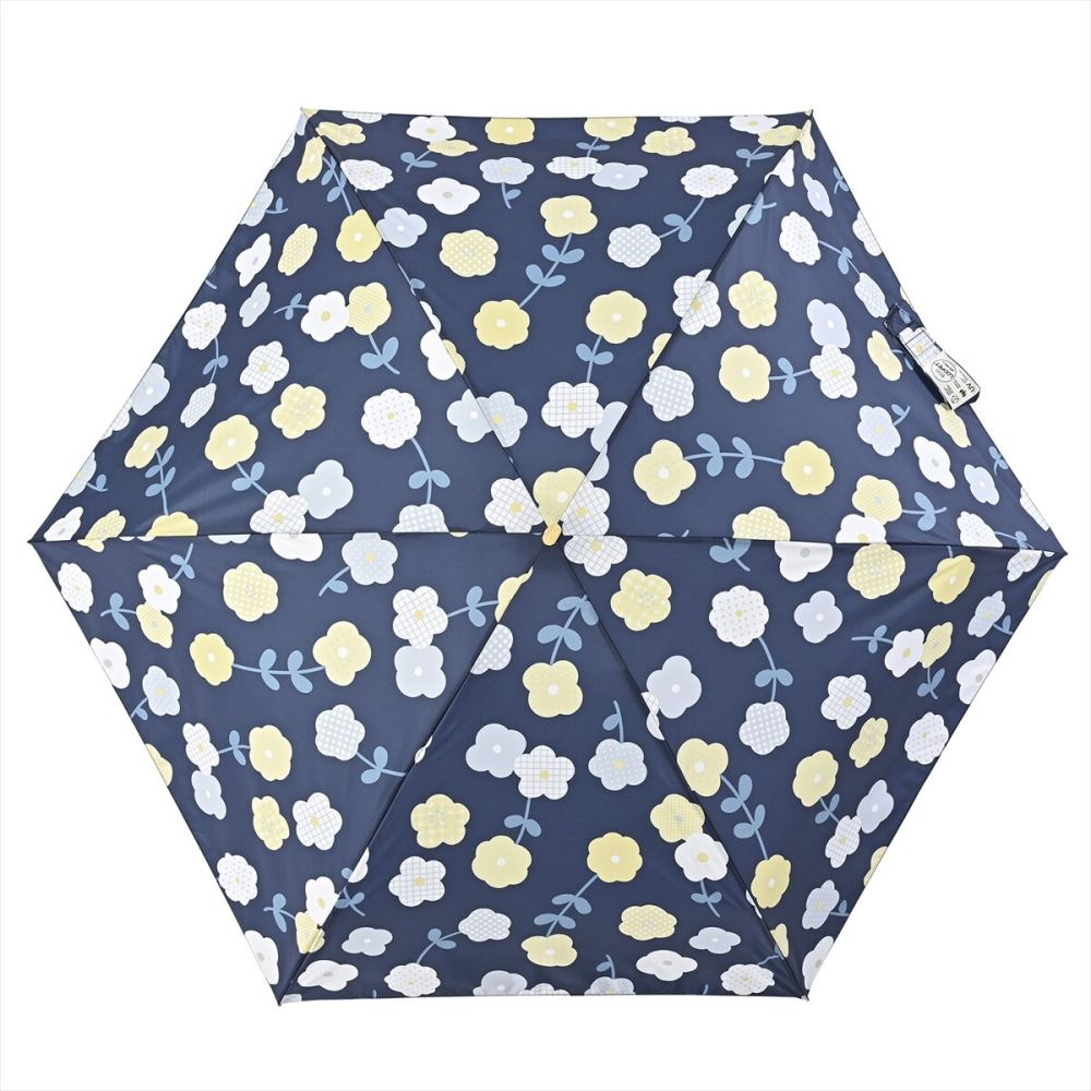 ネイビーの落ち着いたベース色に、イエローとグレーの可愛らしい花が広がります。シンプルな形の花にはチェックやドット模様が描かれ、さりげないアクセントになっています。ケースやベルト部分のブランドネームがモダンでスタイリッシュです。親骨が5段階に伸縮し、フラットに折りたためる骨構造なので、コンパクトになり持ち運びに便利です。ハンドル部分の木目プリントが、ナチュラルな印象です。親骨55cmサイズは、男性にも女性にも使いやすいサイズ感で、年齢性別問わずお使いいただけます。紫外線防止加工を施しているので、遮蔽率が全色90%以上あり、「晴雨兼用傘」として雨の日も晴れの日もオールシーズンお使いいただけます。バッグやフックに付けやすいカラビナもポイントです。