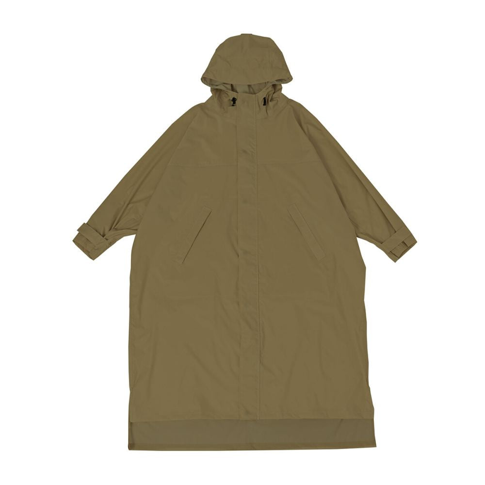 雨の日はもちろん、日常使いでも活躍するユニセックスタイプのレインコートです。ワイドな身幅とドルマンスリーブのゆったりしたサイズ感なので、羽織るだけで様になるカジュアルなデザインになっています。通勤通学で自転車に乗る際、雨の日以外にもアウター感覚で使えます。手の甲をカバーする「手甲」は、使わないときは袖口に折り込んで隠す事ができます。フードのドローコードや前立て、袖口のマジックテープで雨の侵入を防ぎます。フードを被った時に視界が遮られないよう、フード後ろのマジックテープで角度を調節可能です。生地の裏面はポリウレタン加工や縫い目に止水テープを施しているので耐水圧5,000mmと高い防水力を保ちます。また、透湿性で衣服内の蒸れを防ぎます。付属の収納ポーチでコンパクトに収納可能、携帯に便利です。(本製品は防水・はっ水加工しておりますが、完全防水ではございません。落ち着いた色味とユニセックスなシンプルなデザインが、着る人を選ばないカジュアルなレインコートです。適度なビッグシルエットのサイズ感なので、中に着る物を選ばない万能な一着です。