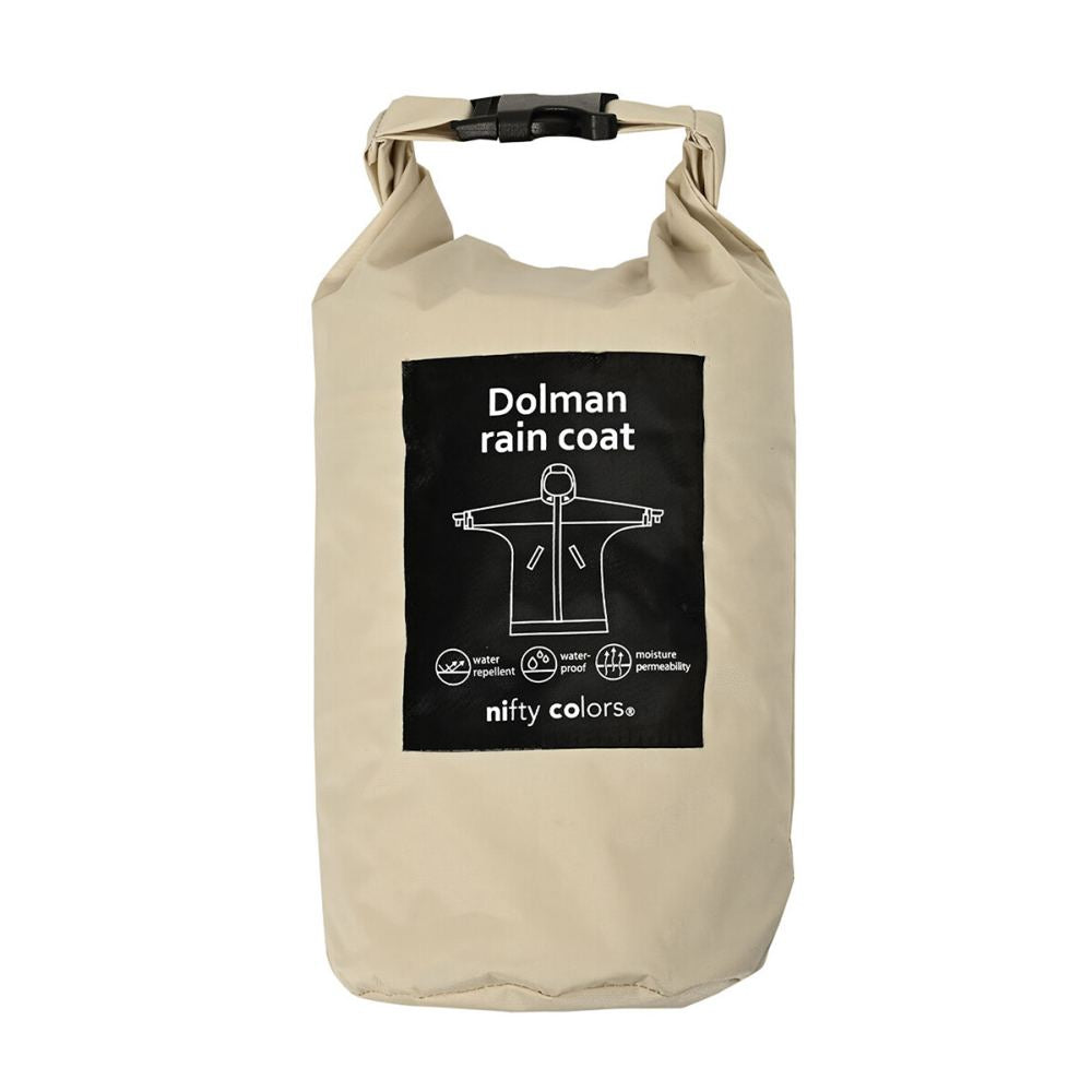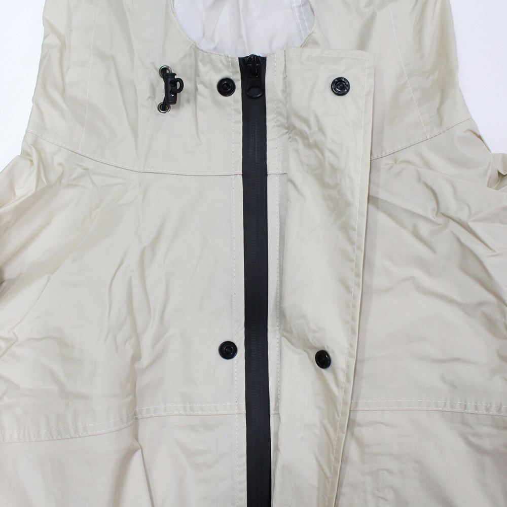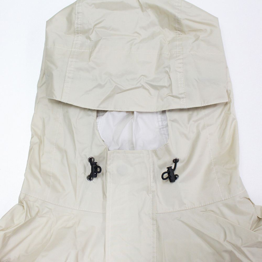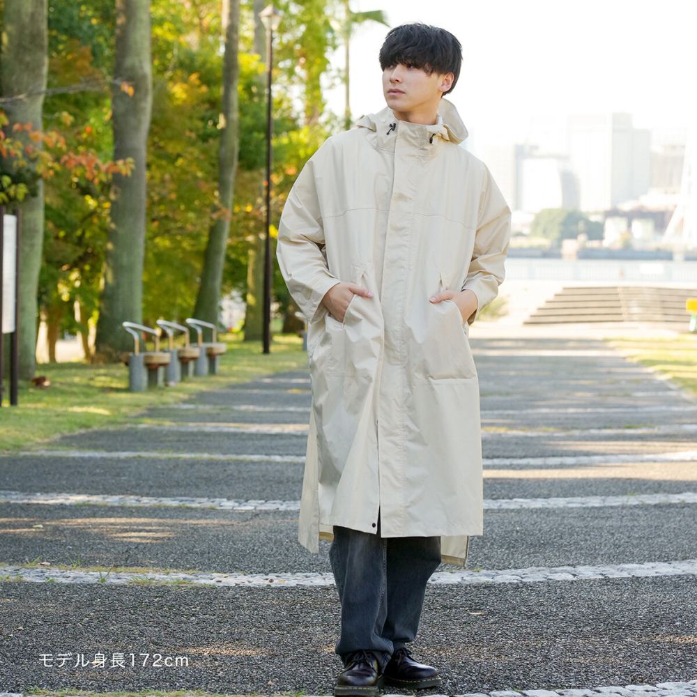 雨の日はもちろん、日常使いでも活躍するユニセックスタイプのレインコートです。ワイドな身幅とドルマンスリーブのゆったりしたサイズ感なので、羽織るだけで様になるカジュアルなデザインになっています。通勤通学で自転車に乗る際、雨の日以外にもアウター感覚で使えます。手の甲をカバーする「手甲」は、使わないときは袖口に折り込んで隠す事ができます。フードのドローコードや前立て、袖口のマジックテープで雨の侵入を防ぎます。フードを被った時に視界が遮られないよう、フード後ろのマジックテープで角度を調節可能です。生地の裏面はポリウレタン加工や縫い目に止水テープを施しているので耐水圧5,000mmと高い防水力を保ちます。また、透湿性で衣服内の蒸れを防ぎます。付属の収納ポーチでコンパクトに収納可能、携帯に便利です。(本製品は防水・はっ水加工しておりますが、完全防水ではございません。落ち着いた色味とユニセックスなシンプルなデザインが、着る人を選ばないカジュアルなレインコートです。適度なビッグシルエットのサイズ感なので、中に着る物を選ばない万能な一着です。