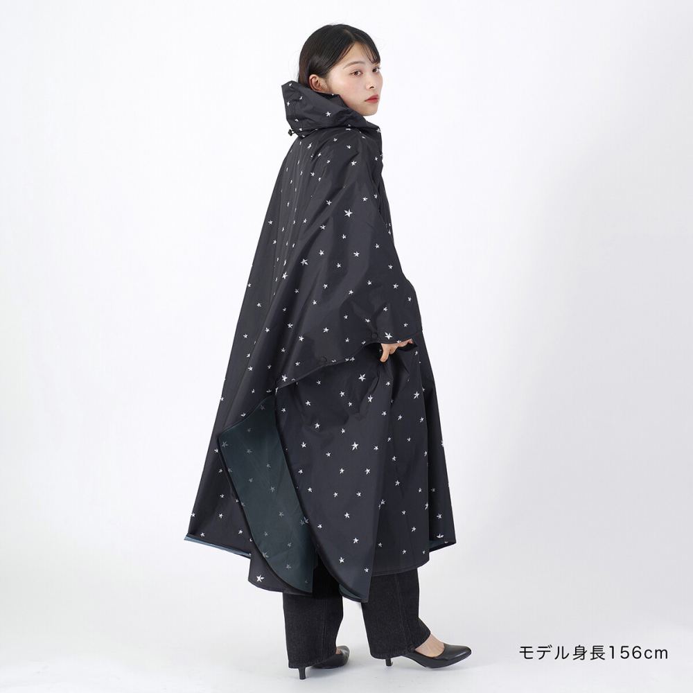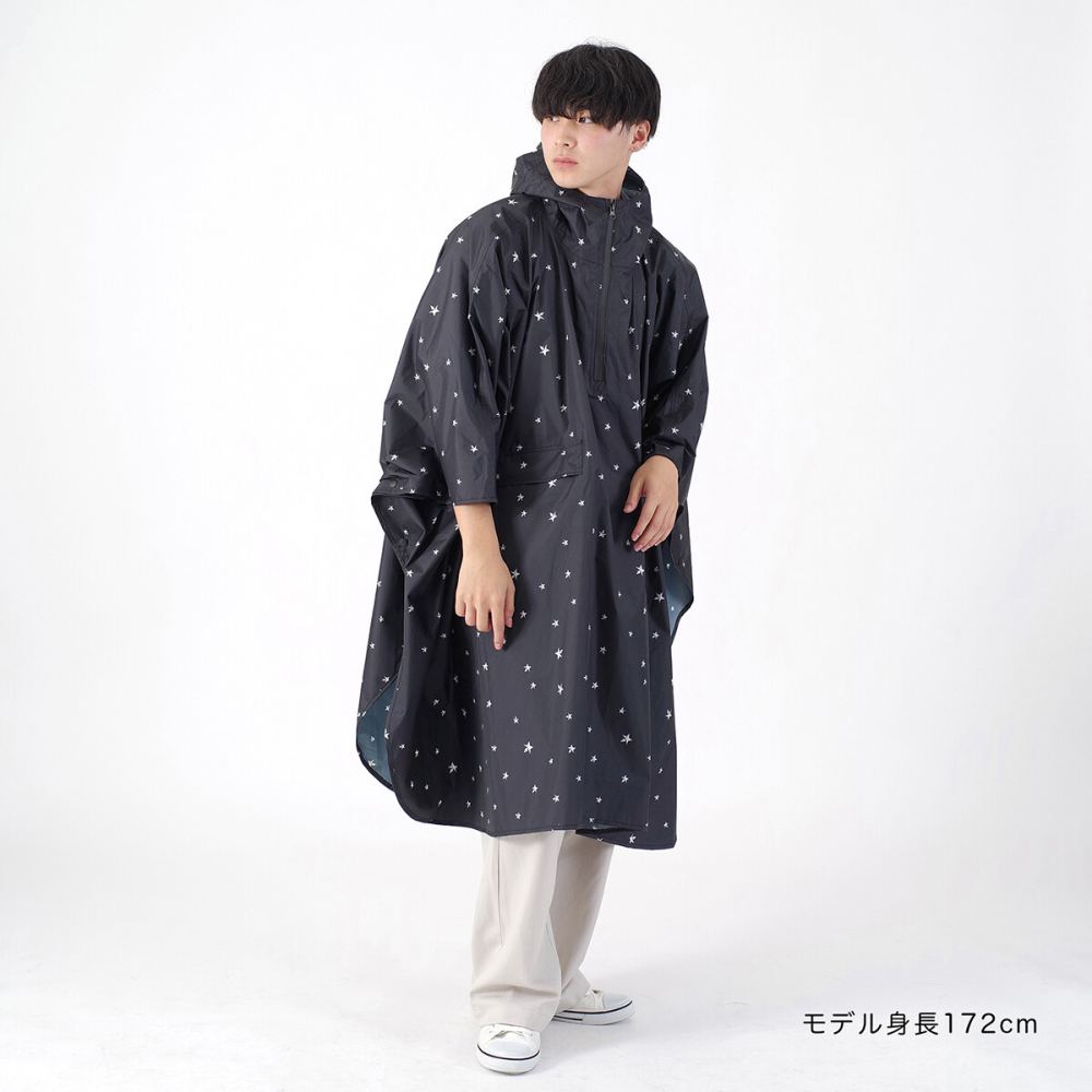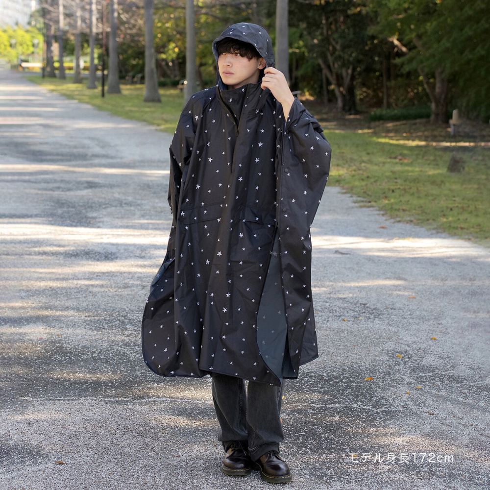 アウトドアやレジャー、通勤通学に便利なレインポンチョは、さっと被って着用できるので急な雨の時に便利です。ゆったりした長めのサイズ感なので、ユニセックスでお使いいただけます。ポンチョタイプはリュックを背負ったままで着用できます。生地の裏面はポリウレタン加工や縫い目に止水テープを施しているので耐水圧3,000mmの防水力を保ちます。付属の収納ポーチでコンパクトに収納可能、携帯に便利です。(本製品は防水・はっ水加工しておりますが、完全防水ではございません。)立体感があるスタッズ風のスター柄のデザインです。ランダムに大小のスターが散りばめられていて、男性はもちろん、かっこいいファッションが好きな女性にもピッタリです。