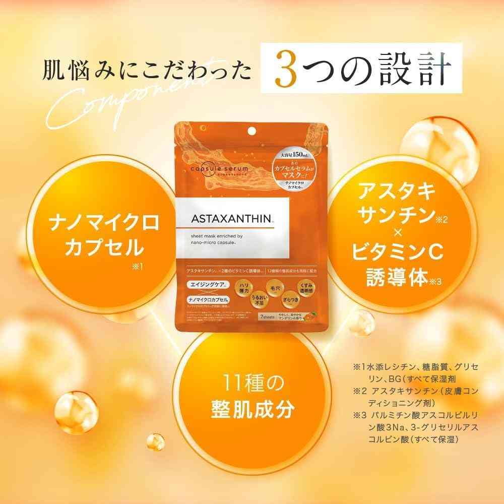 (1)お肌に浸透しやすいナノマイクロカプセルに濃縮した、アスタキサンチンと2種類のビタミンC誘導体を配合。