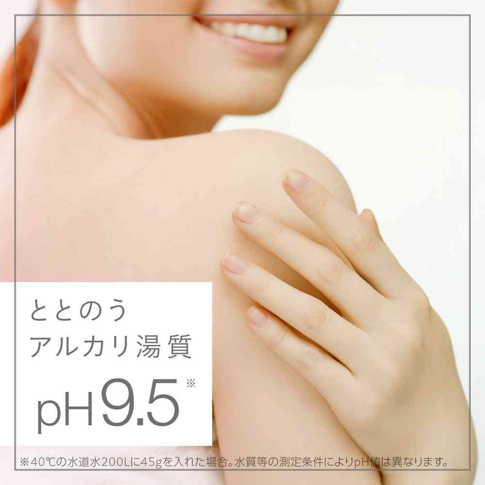 ●ととのうアルカリ湯質pH9.5(※40℃の水道水200Lに45gを入れた場合。水質等の測定条件によりpH値は異なります。):古い角質や余分な皮脂汚れを落としてお肌なめらかに
