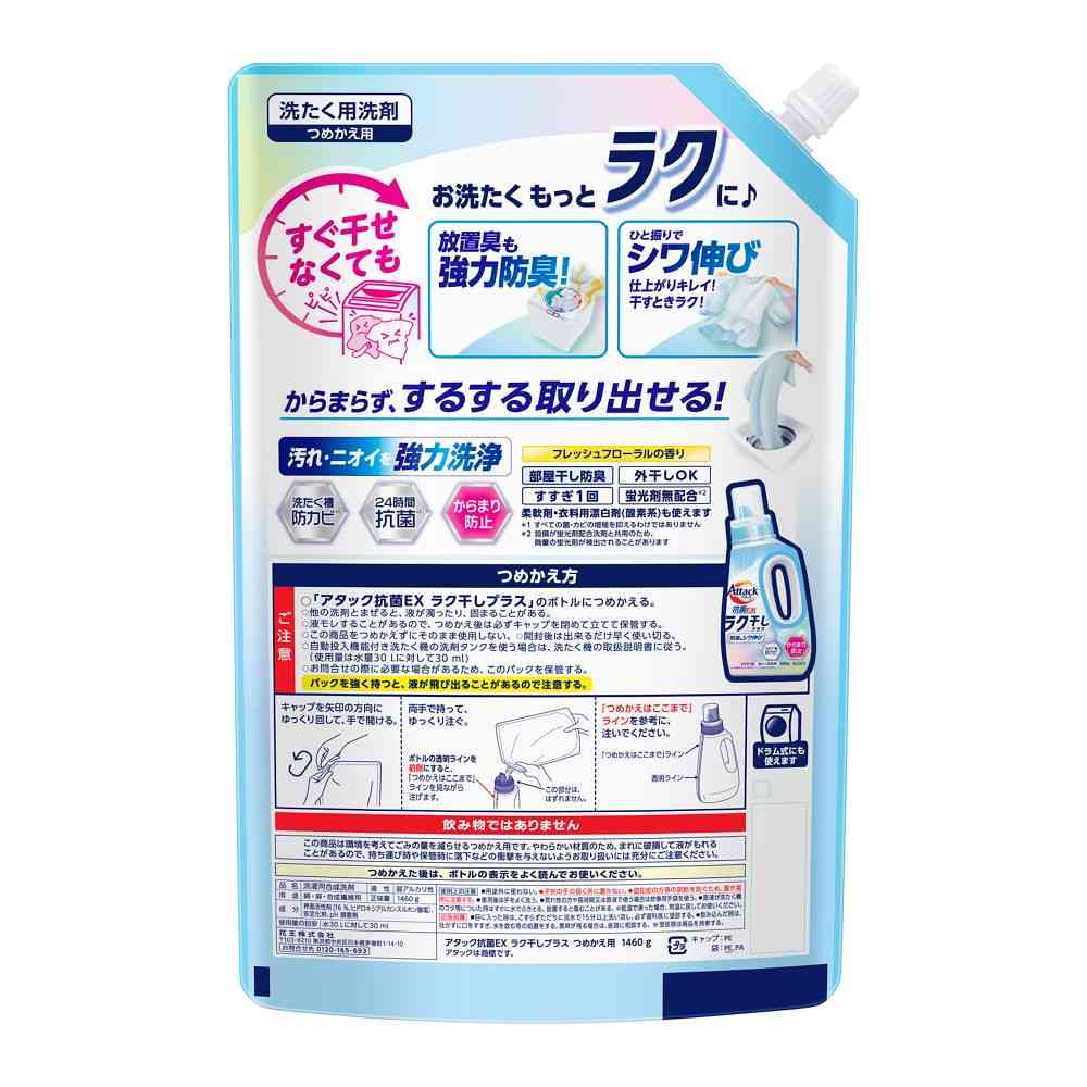 ○「アタック抗菌EX ラク干しプラス」のボトルにつめかえる。あふれることがあるので、注意してつめかえてください。