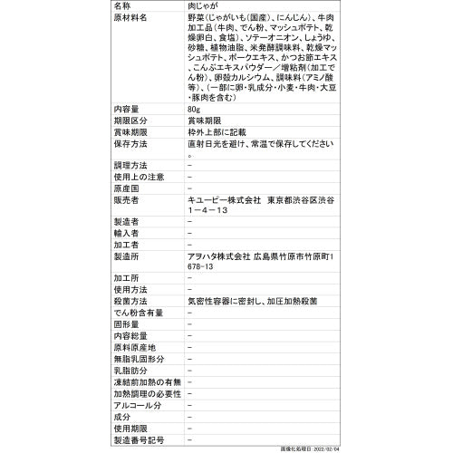 Calorie per bag (80g) 57(kcal) Protein 1.4(g) Fat 1.8(g) Carbohydrate 8.7(g) Salt equivalent 0.5(g) Sodium-(mg)