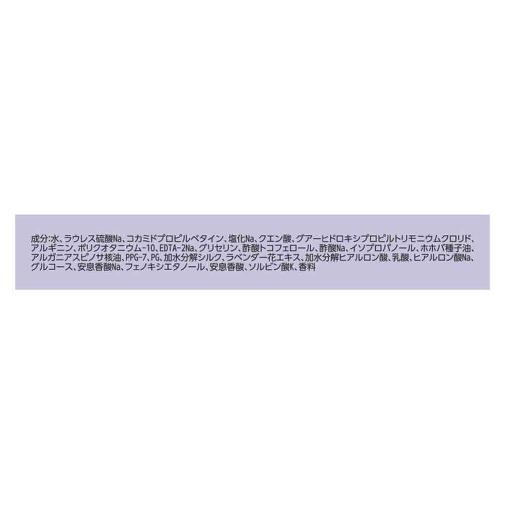 水、ラウレス硫酸Na、コカミドプロピルベタイン、塩化Na、クエン酸、グアーヒドロキシプロピルトリモニウムクロリド、アルギニン、ポリクオタニウム-10、EDTA-2Na、グリセリン、酢酸トコフェロール、酢酸Na、イソプロパノール、ホホバ種子油、アルガニアスピノサ核油、PPG-7、PG、加水分解シルク、ラベンダー花エキス、加水分解ヒアルロン酸、乳酸、ヒアルロン酸Na、グルコース、安息香酸Na、フェノキシエタノール、安息香酸、ソルビン酸K、香料