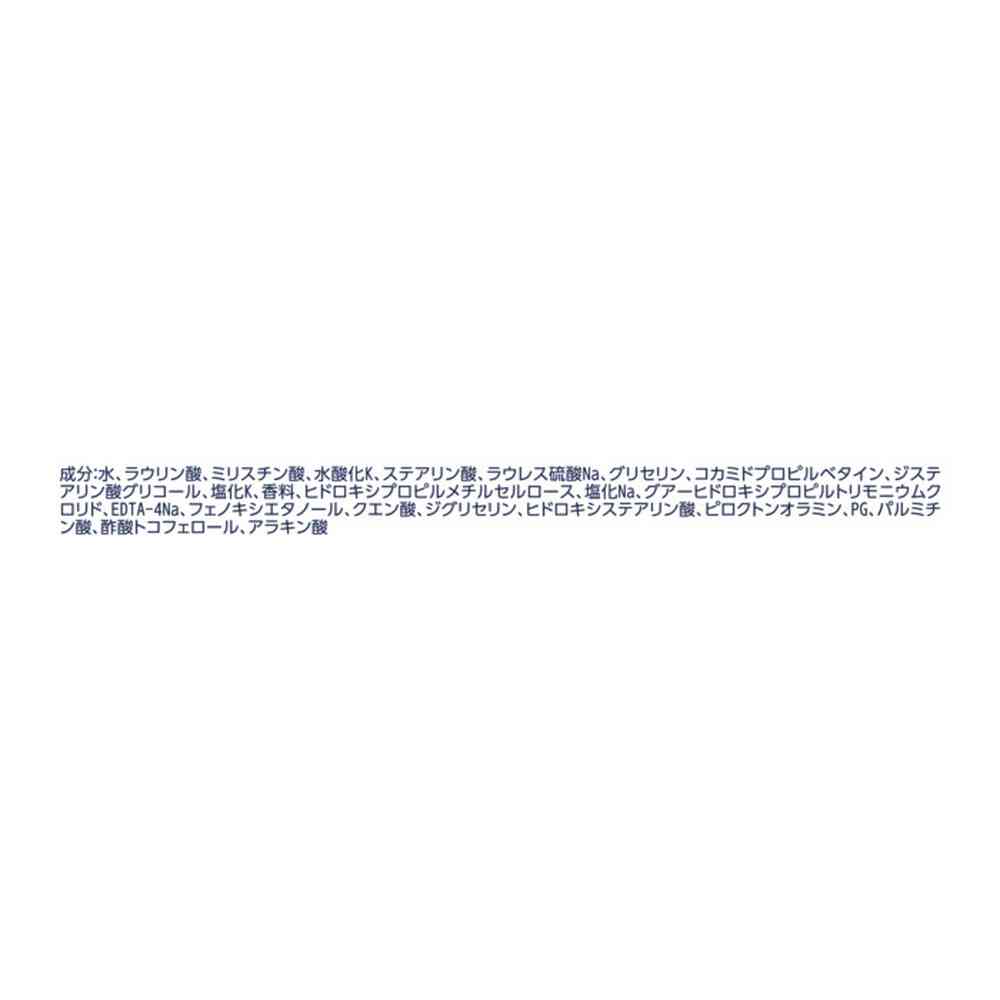 水、ラウリン酸、ミリスチン酸、水酸化K、ステアリン酸、ラウレス硫酸Na、グリセリン、コカミドプロピルベタイン、ジステアリン酸グリコール、塩化K、香料、ヒドロキシプロピルメチルセルロース、塩化Na、グアーヒドロキシプロピルトリモニウムクロリド、EDTA-4Na、フェノキシエタノール、クエン酸、ジグリセリン、ヒドロキシステアリン酸、ピロクトンオラミン、PG、パルミチン酸、酢酸トコフェロール、アラキン酸
