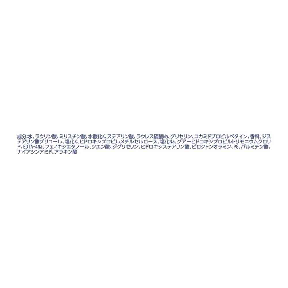 水、ラウリン酸、ミリスチン酸、水酸化K、ステアリン酸、ラウレス硫酸Na、グリセリン、コカミドプロピルベタイン、香料、ジステアリン酸グリコール、塩化K、ヒドロキシプロピルメチルセルロース、塩化Na、グアーヒドロキシプロピルトリモニウムクロリド、EDTA-4Na、フェノキシエタノール、クエン酸、ジグリセリン、ヒドロキシステアリン酸、ピロクトンオラミン、PG、パルミチン酸、ナイアシンアミド、アラキン酸