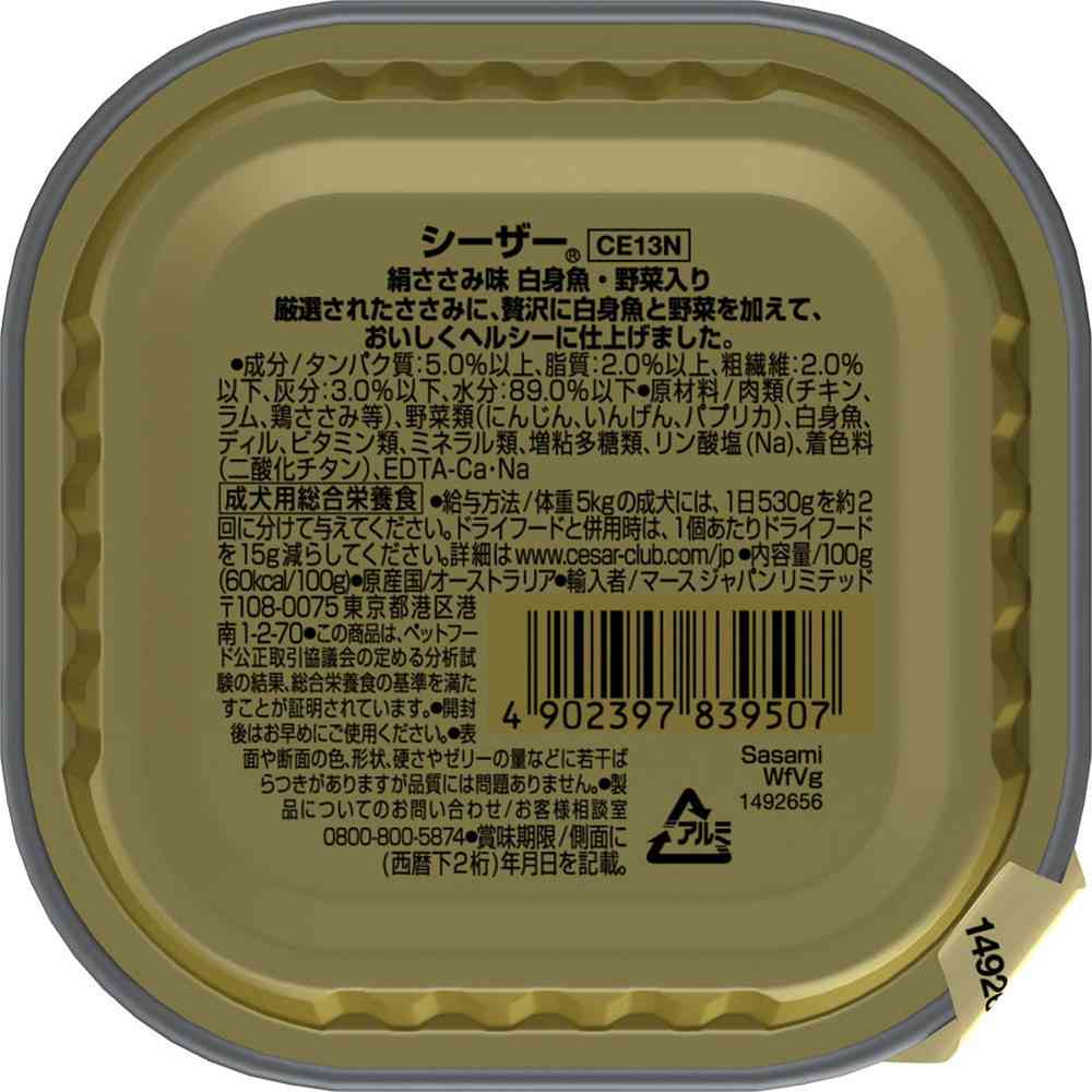 肉類(チキン、ラム、鶏ささみ等)、野菜類(にんじん、いんげん、パプリカ)、白身魚、ディル、ビタミン類、ミネラル類、増粘多糖類、リン酸塩(Na)、着色料(二酸化チタン)、EDTA-Ca・Na