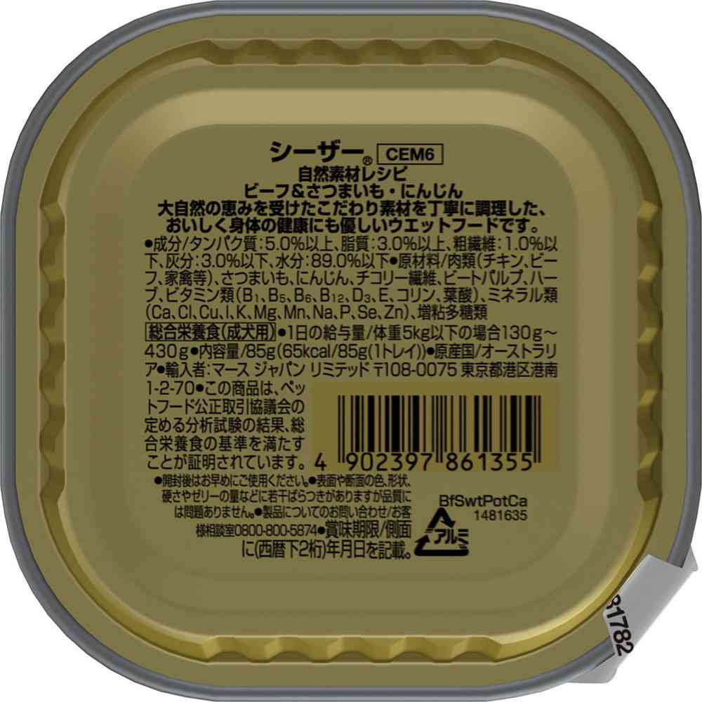 肉類(チキン、ビーフ等)、野菜類(にんじん等)、さつまいも、チコリー繊維、ビートパルプ、ローズマリー、ぶどう糖、ビタミン類、ミネラル類、増粘多糖類