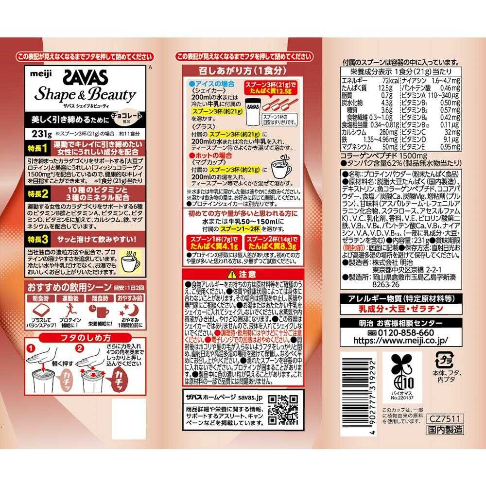 脱脂大豆たんぱく(国内製造)、デキストリン、魚コラーゲンペプチド、ココアパウダー、食塩/炭酸Ca、炭酸Mg、増粘剤(プルラン)、甘味料(アスパルテーム・L-フェニルアラニン化合物、スクラロース、アセスルファムK)V.C、乳化剤、香料、V.E、ピロリン酸第二鉄、V.B2、V.B4、パントテン酸Ca、V.B1、ナイアシン、V.A、V.D、V.B12、(一部に乳成分・大豆・ゼラチンを含む)