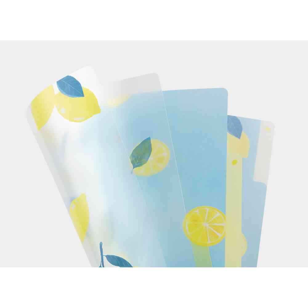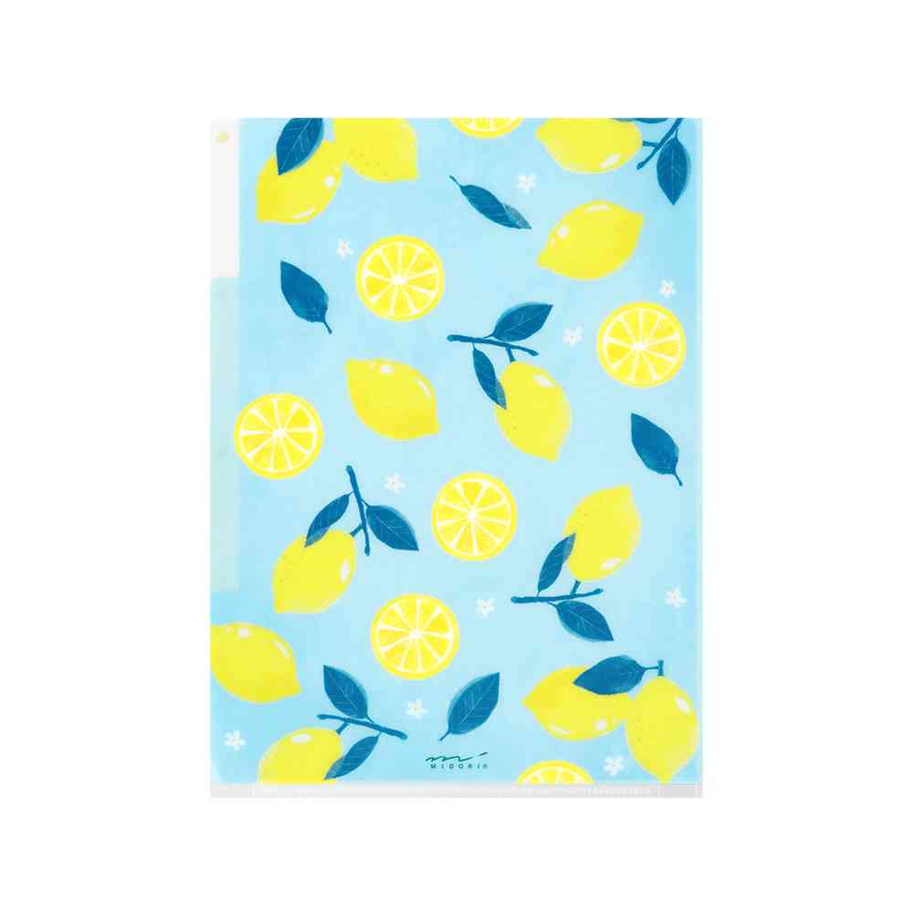 爽やかなブルーの背景に手書き風のレモンが散りばめられた、かわいらしいデザインです。