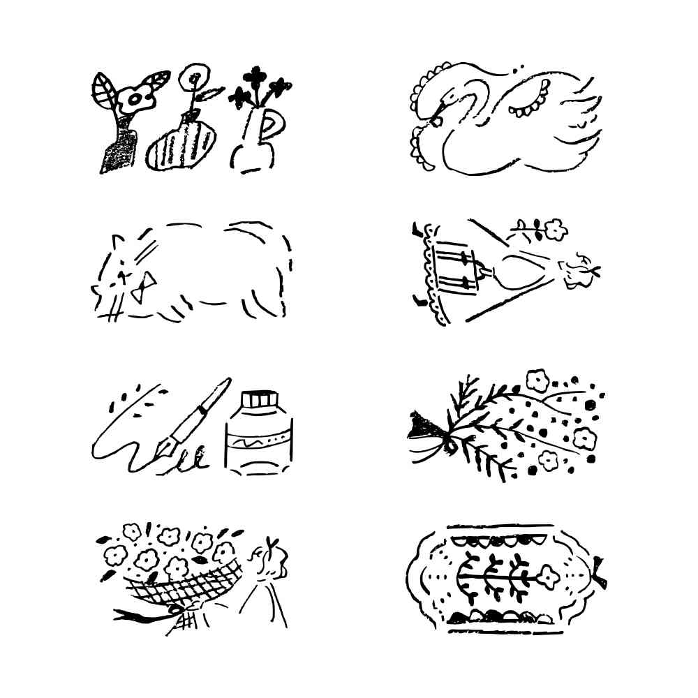 フレンチブロカントをイメージしつつ、雑貨や動物をラフなタッチで表現したデザインです。