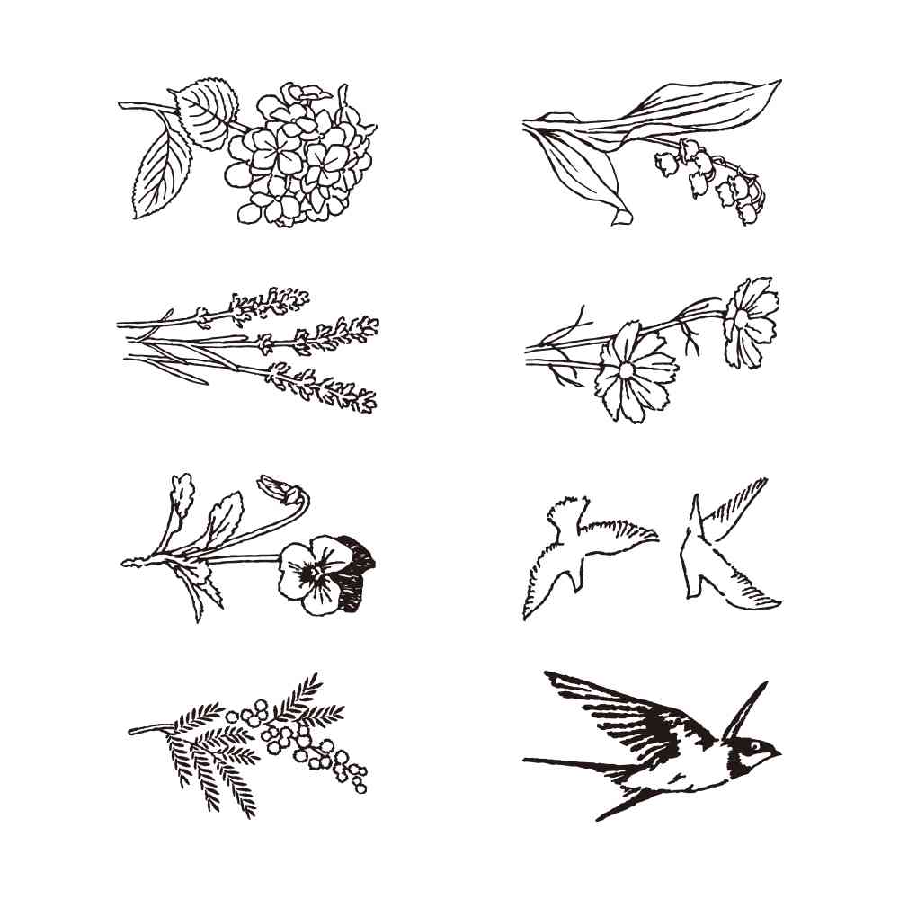 季節を問わずに人気のある花に、その周りを飛ぶトリたちを加えたデザインです。