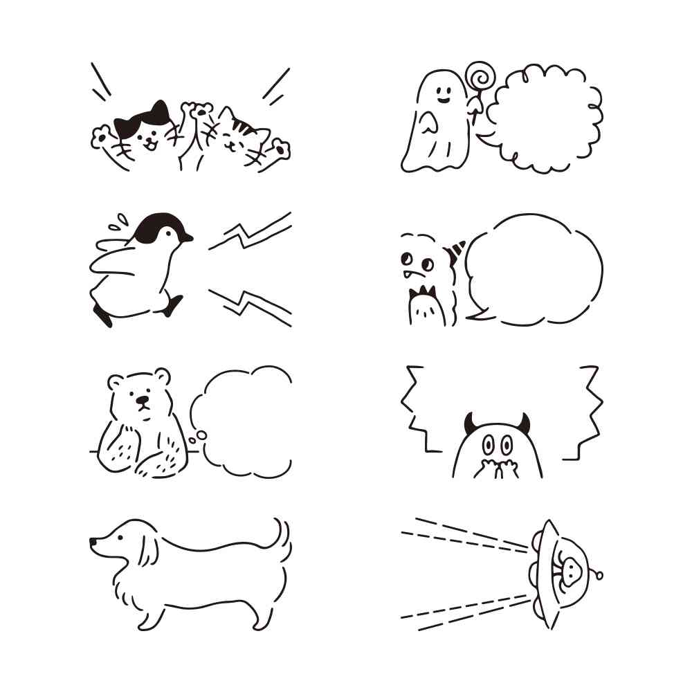 おなじみの動物に加えて、オバケや宇宙人なども登場する、ユニークな吹き出しデザインです。
