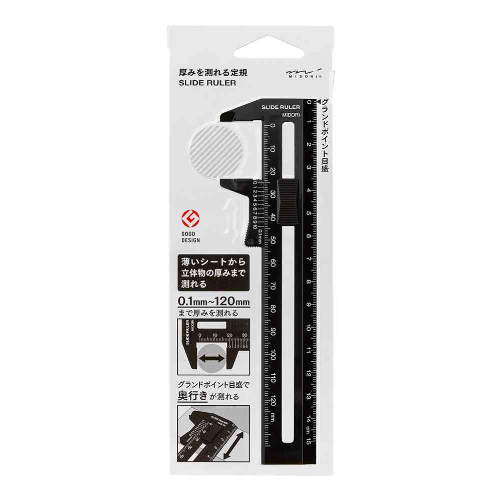プロのツールよりもっと手軽に、薄いシートから立体物の厚みまで測定できる定規です。