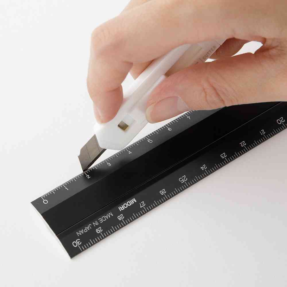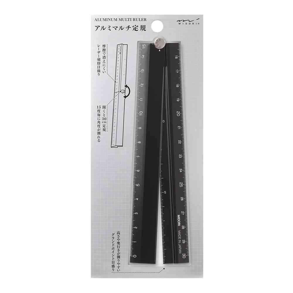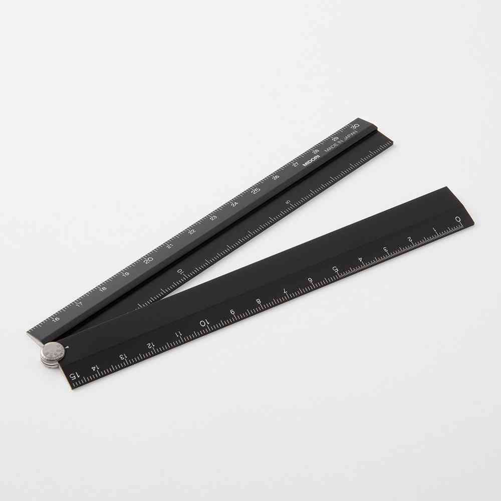 使用時には30cm、使わない時には二つ折りにたたんで、胸ポケットやペンケースに収納が可能なロングセラー「マルチ定規」の軽くて丈夫なアルミ素材タイプ。