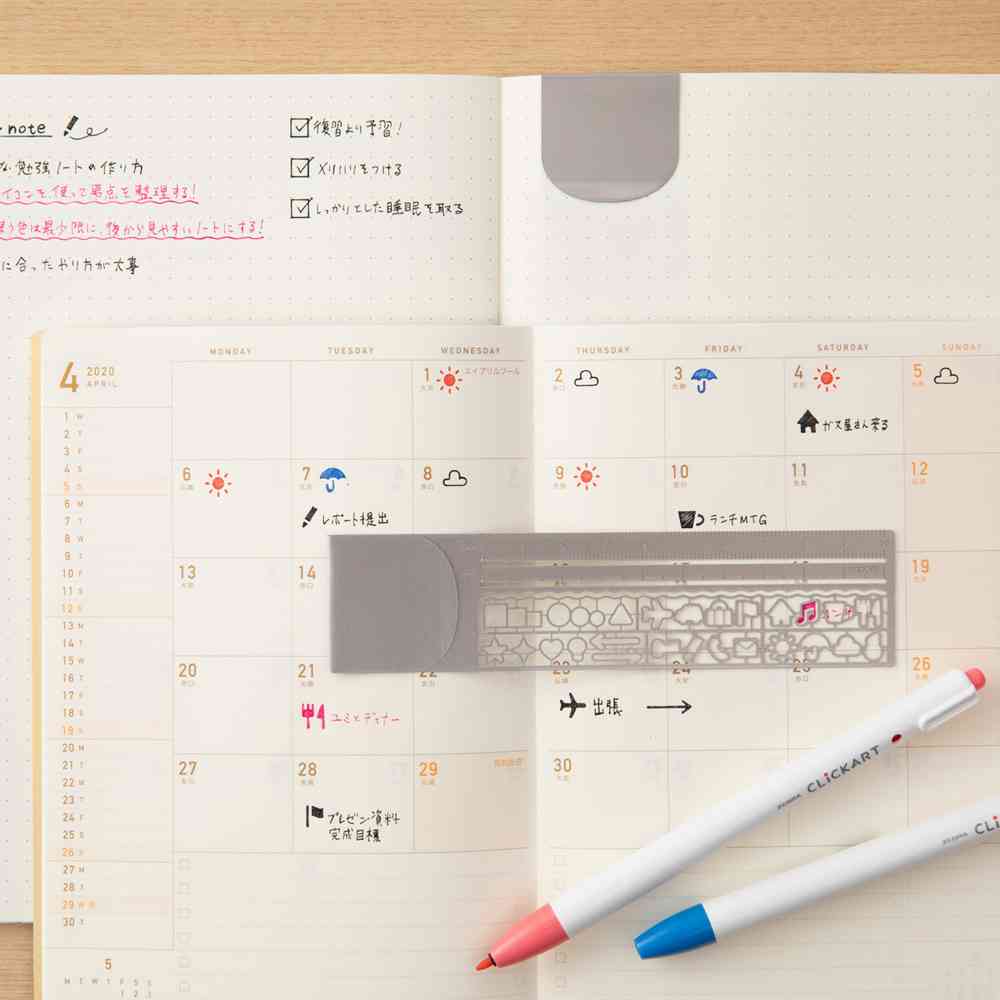 ページに挟んでインデックスがわりに使用できるほか、スケジューリングやノート作りなどに便利なテンプレートが30種類ついているのでマークをいつでもきれいに描けます。
