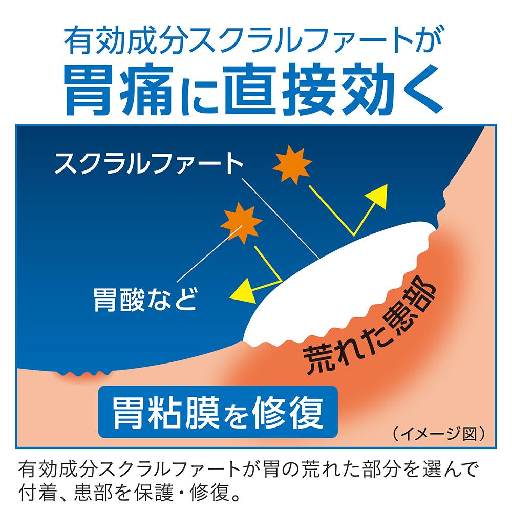 Directly repairs the affected area caused by stomachache, heavy stomach, and nausea ○ Directly protects and repairs the source of stomach pain (roughened affected area of the gastric mucosa) Sucralfate sticks directly to the affected area to protect it from attacks such as gastric acid. At the same time, we will repair the affected area and cure it from the beginning.
