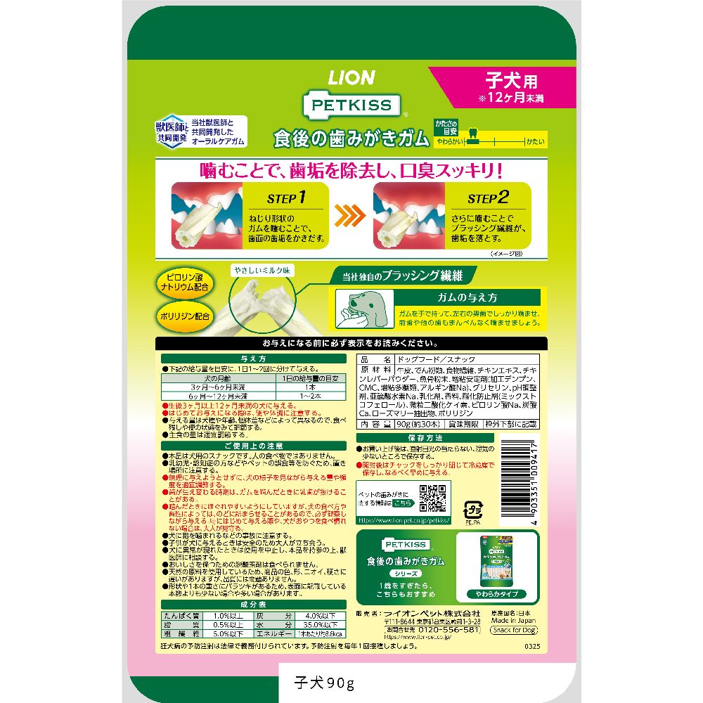 当社獣医師と共同開発した歯みがきガム。やわらかく細いガムを束ねたロープ状ガム。細いロープのねじり形状ガムを噛むことで、歯面の歯垢をかき出す。さらに噛むことで、歯垢を落として口臭を抑制。ミルク風味。ピロリン酸ナトリウム、ポリリジン配合。