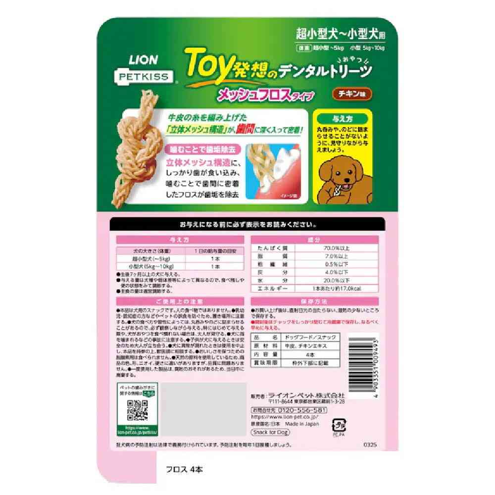 牛皮の糸を編み上げた立体メッシュ構造が歯間に入り、噛むことで歯垢を除去。