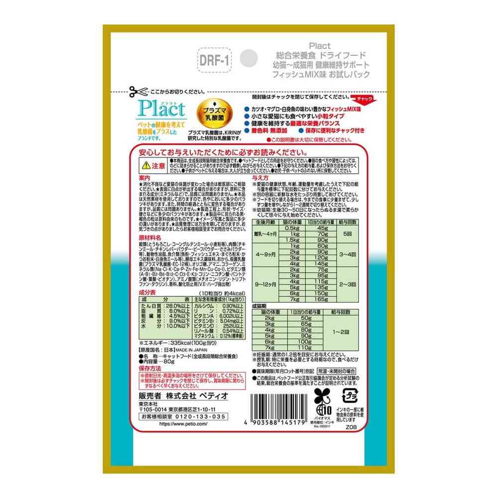 穀類(とうもろこし・コーングルテンミール・小麦粉等)、肉類(チキンミール・チキンレバーパウダー・ビーフパウダー・ささみパウダー等)、動物性油脂、魚介類(魚粉・フィッシュエキス・まぐろ粉末・かつお粉末・白身魚ミール等)、酵母エキス調味料、おから、殺菌乳酸菌(プラズマ乳酸菌・EC-12株)、オリゴ糖、アマニ、コラーゲン、ミネラル類(Na・Cl・K・Ca・P・Zn・Fe・Mn・Cu・Co・I)、ビタミン類(A・B1・B2・B6・B12・C・D3・E・K3・コリン・ニコチン酸・パントテン酸・葉酸・ビオチン)、アミノ酸類(メチオニン・リジン・トリプトファン・タウリン)、香料、酸化防止剤(V. E・ハーブ抽出物) たん白質:28.0%以上、脂質:8.0%以上、粗繊維:4.5%以下、灰分:9.0%以下、水分:10.0%以下、カルシウム:0.90%以上、リン:0.72%以上、ビタミンA:6002IU以上、ビタミンB1:5.04mg以上、ビタミンD:252IU以上、リノール酸:0.54%以上、マグネシウム:0.12%(標準値)