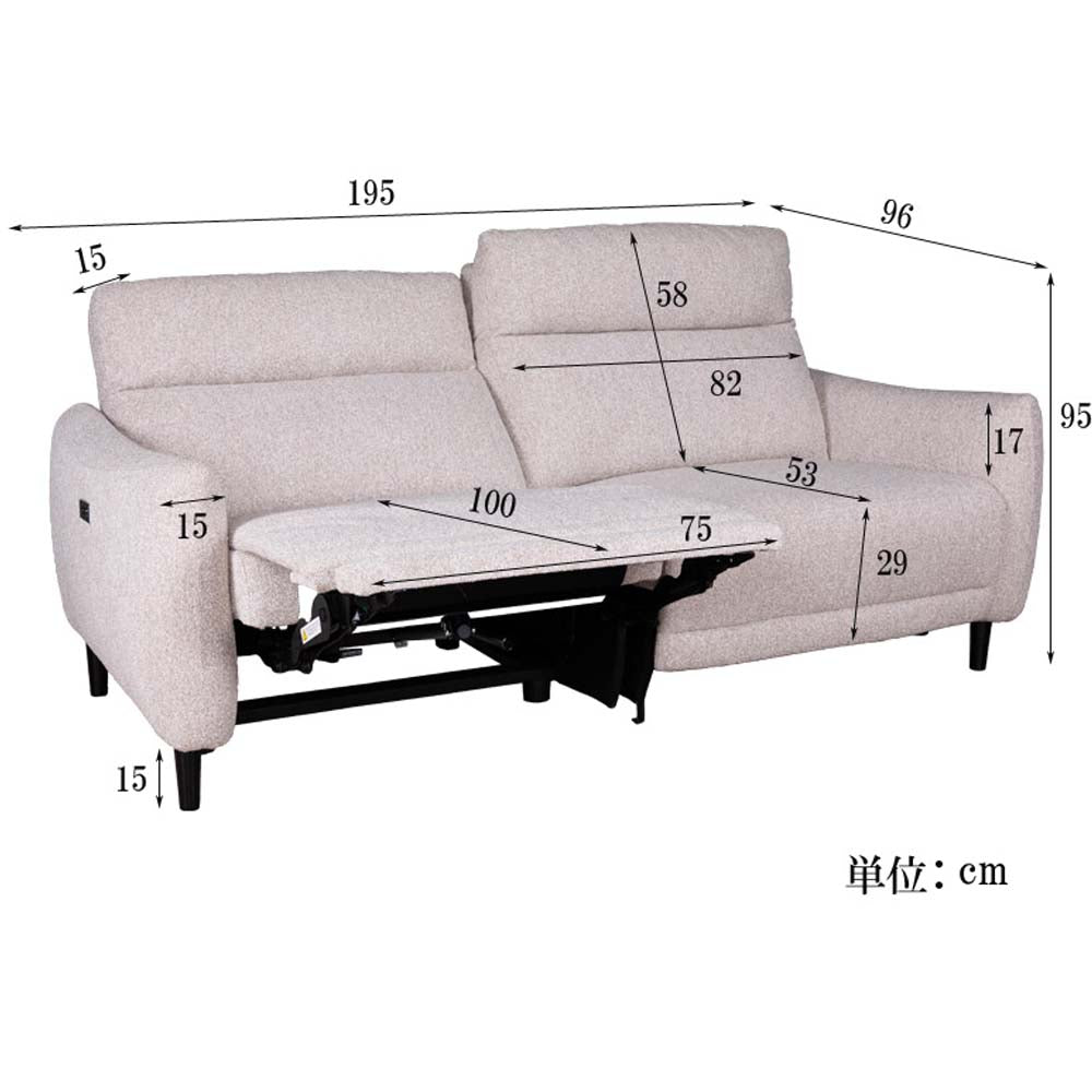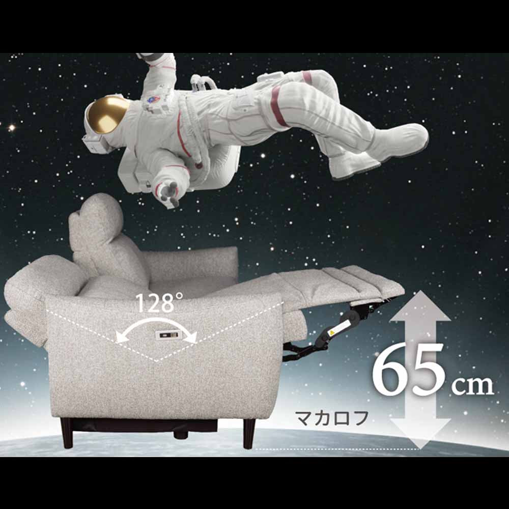 リクライニング可動域128°と広く、寛げる角度を細かく調整できる電動ソファー、ゼログラビティメカニズム採用。