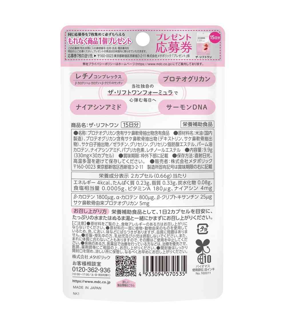 3つのプロビタミンAカロテノイドを配合した「レチノコンプレックス」、サケ鼻軟骨由来の糖たんぱく質で貴重な成分の「プロテオグリカン」、ビタミンB群の一種「ナイアシンアミド」、たんぱく質、脂質を除去しDNAを高含有させたサケ白子抽出物「サーモンDNA」をツヤめくハリ玉カプセルに独自配合。