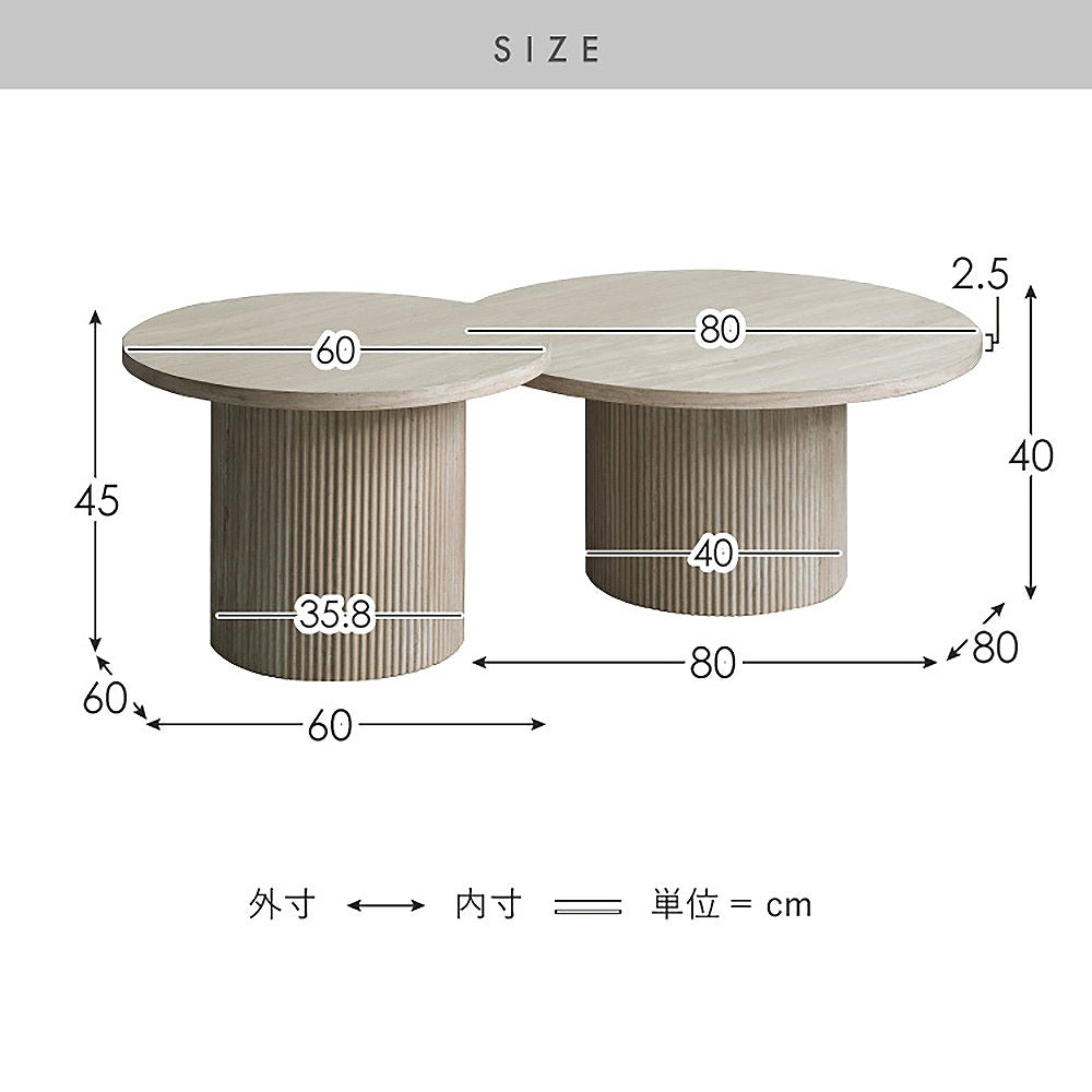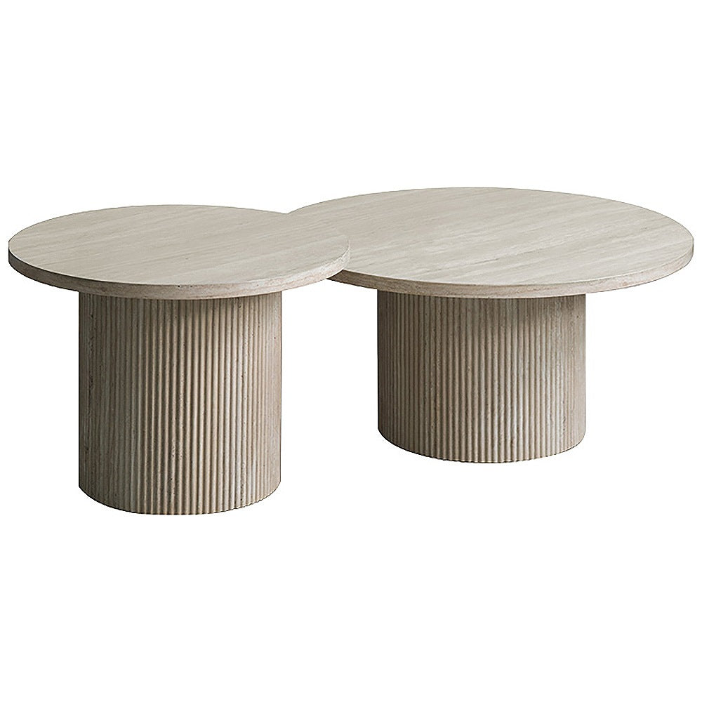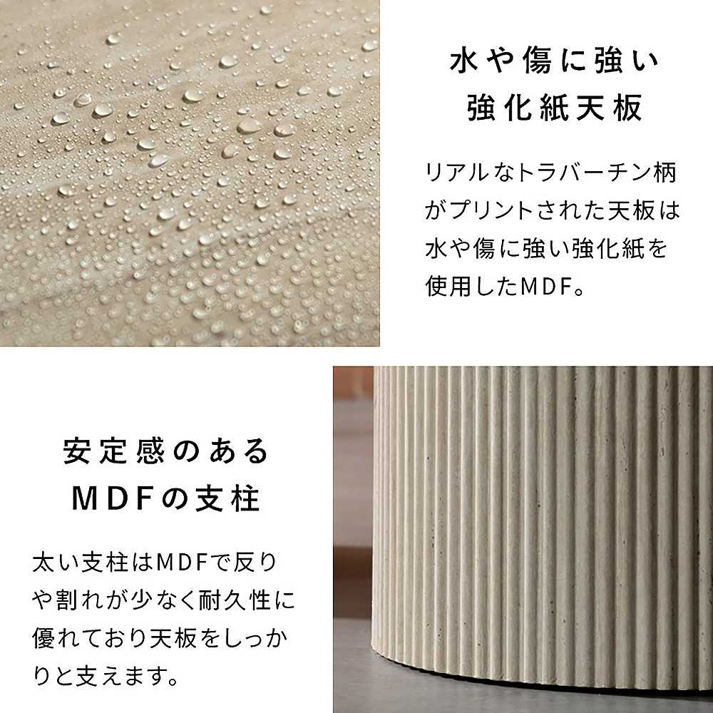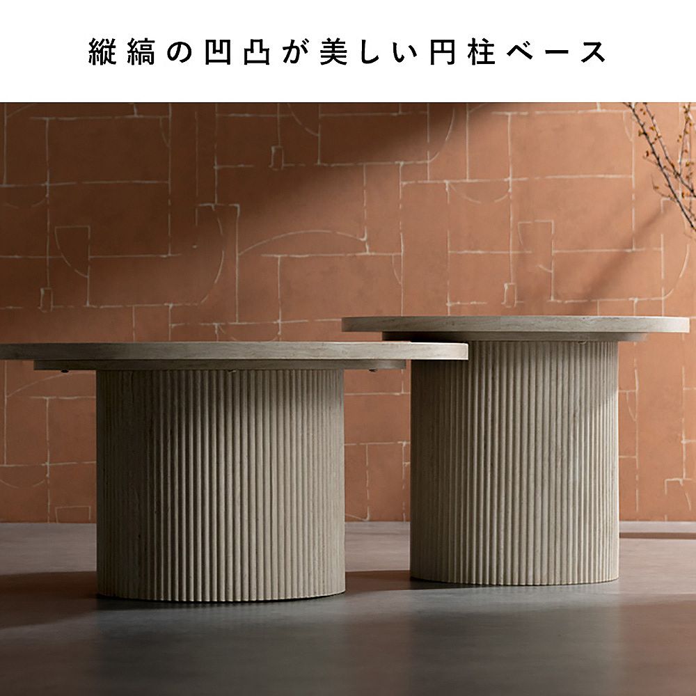 不規則な穴や縞状の独特な模様の天然石トラバーチン(石灰岩)を模した柄と縦縞の円柱デザインが印象的なネストセンターテーブル『Sarnia(サニア)』。サイズの異なる二つのテーブルは重ねたり切り離したり、自由なレイアウトが可能でリビングや寝室などお家の色々な場所でお使いいただけます。製品重量:大17.7/小15.8kg 組立式(約20分)