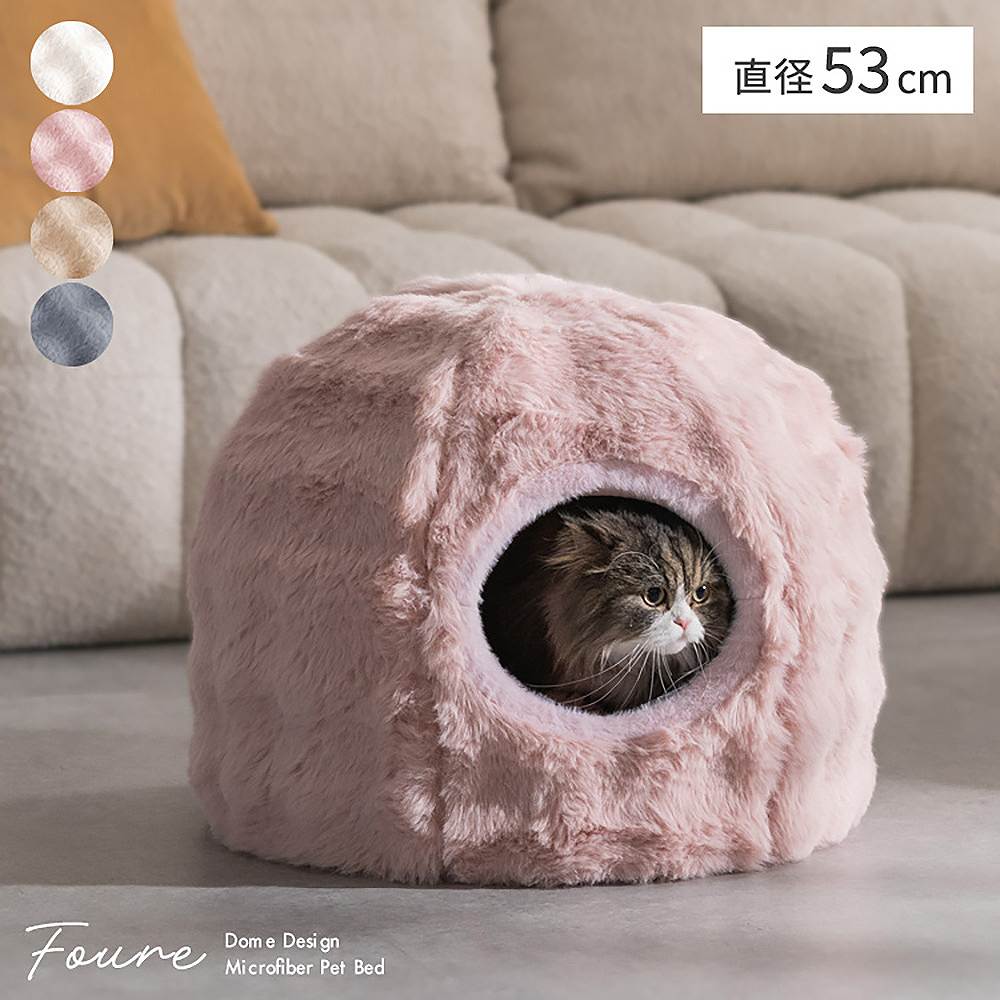 ふわとろなマイクロファイバー生地の可愛いドーム型ペットベッド『Foure(フール)』。狭くて落ち着くドームの中にはリバーシブルクッション付き。猫はもちろん小型犬もお使いいただけます。また、上部を潰せばベッド型にもなります。カラーはホワイト、ピンク、ベージュ、グレーの4種類。お部屋の雰囲気やお好みでお選びいただけます。製品重量:1.3kg 完成品