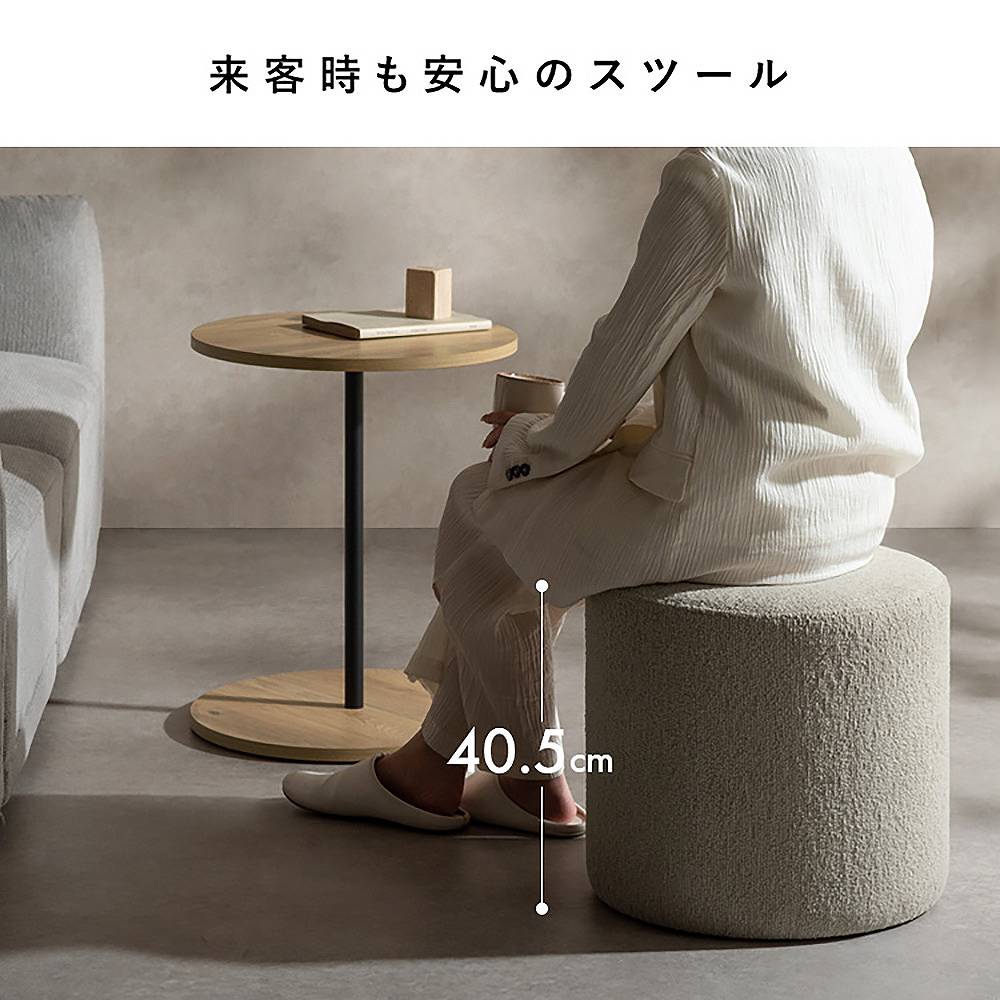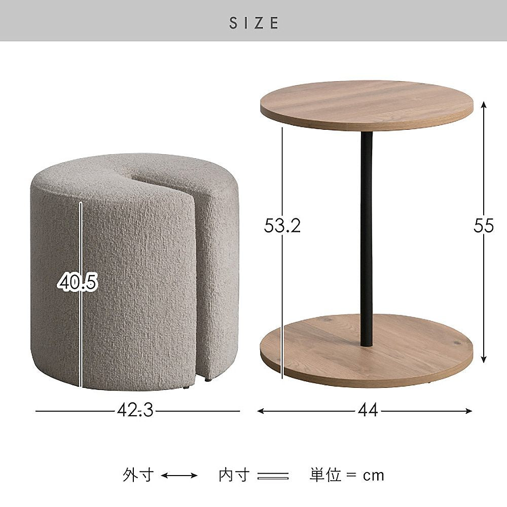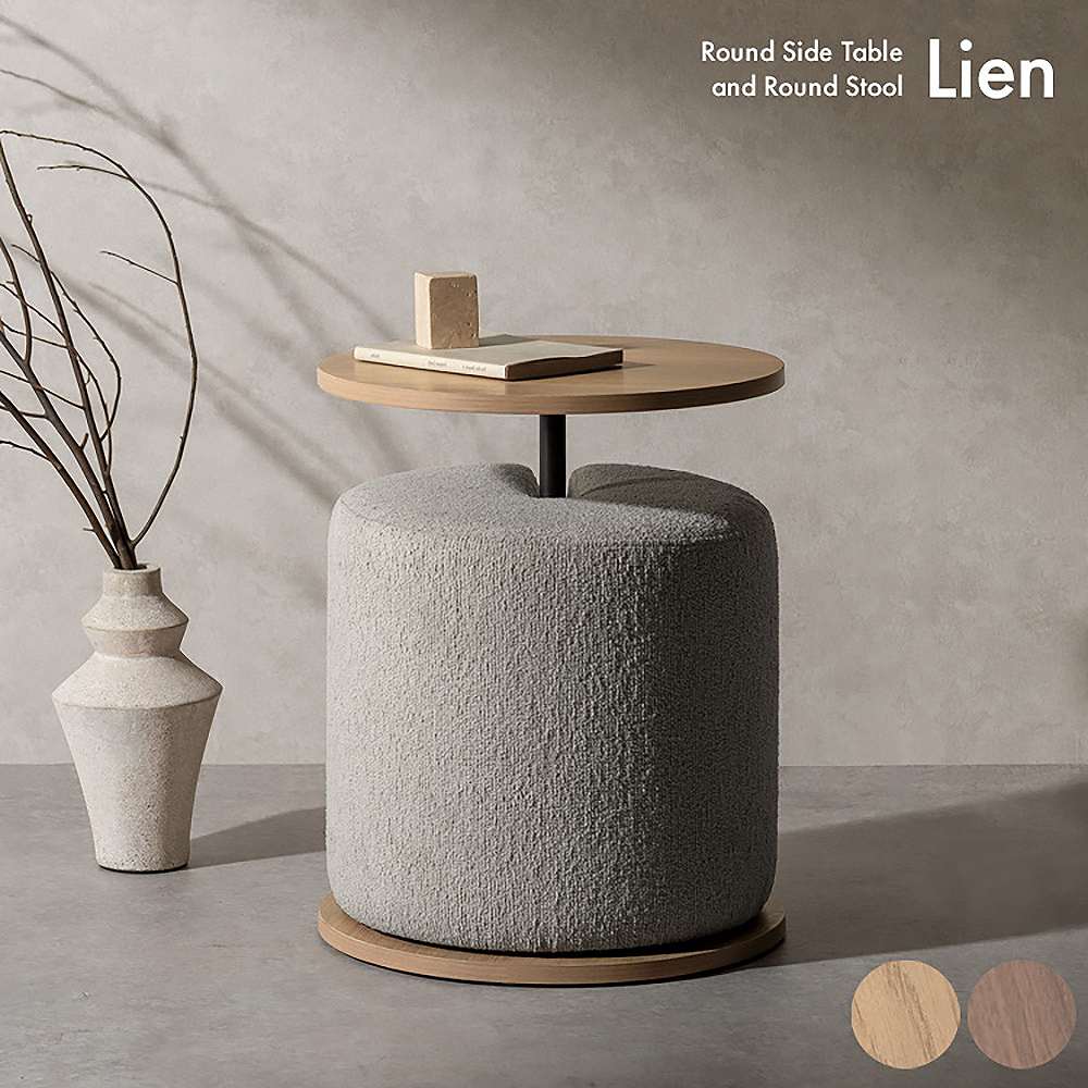 木目柄のラウンドサイドテーブルと天板下に収納できるスリット付きのスツールがセットになった『Lien(リエン)』。必要なときにサッと取り出せるスツールは来客時などに便利にお使いいただけます。カラーはナチュラルとブラウンの2カラーからお部屋の雰囲気やお好みでお選びいただけます。製品重量:11.9kg 組立式(約15分)