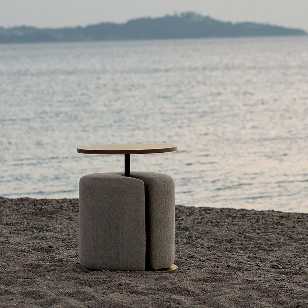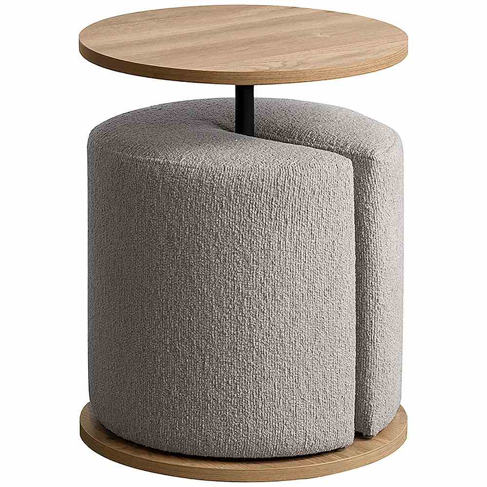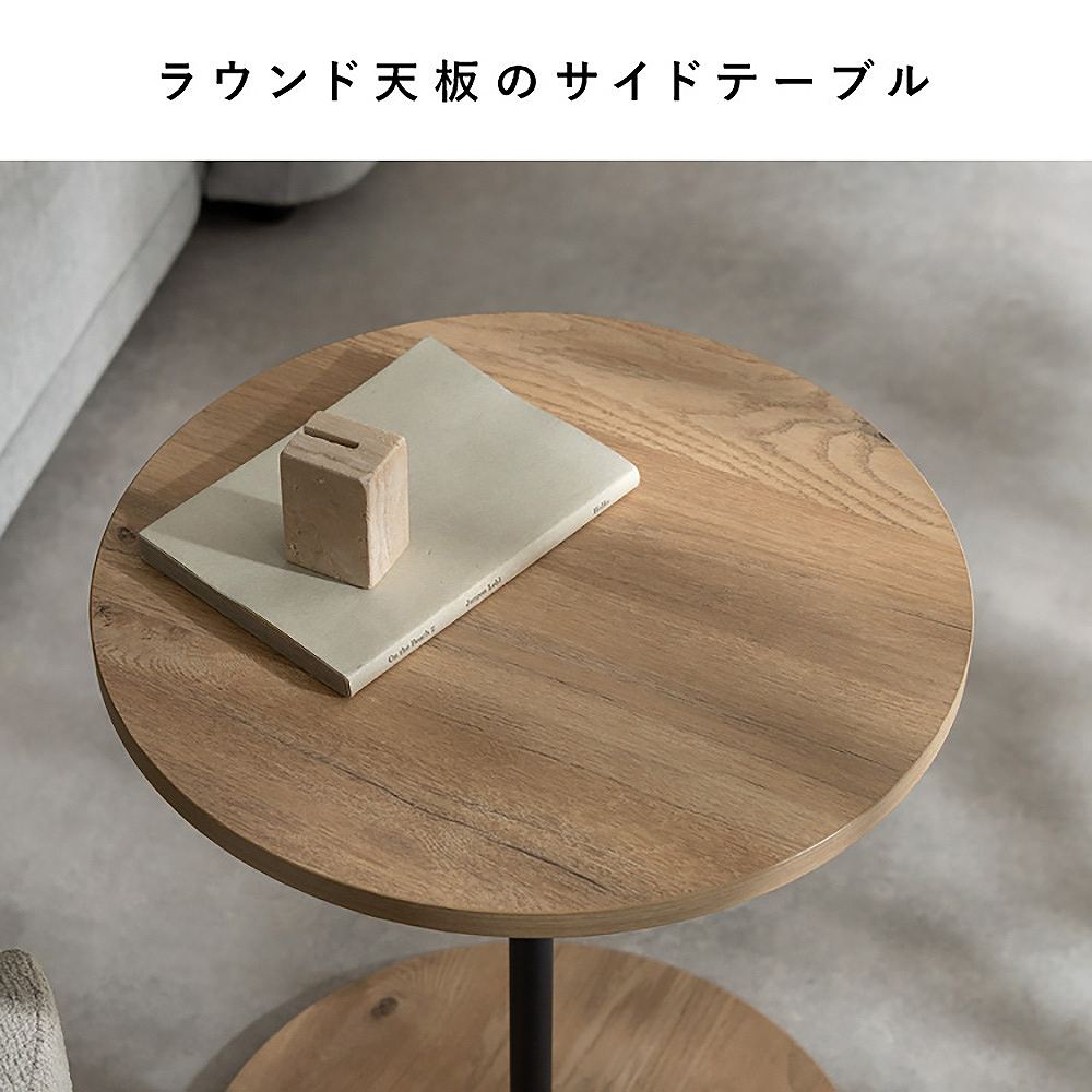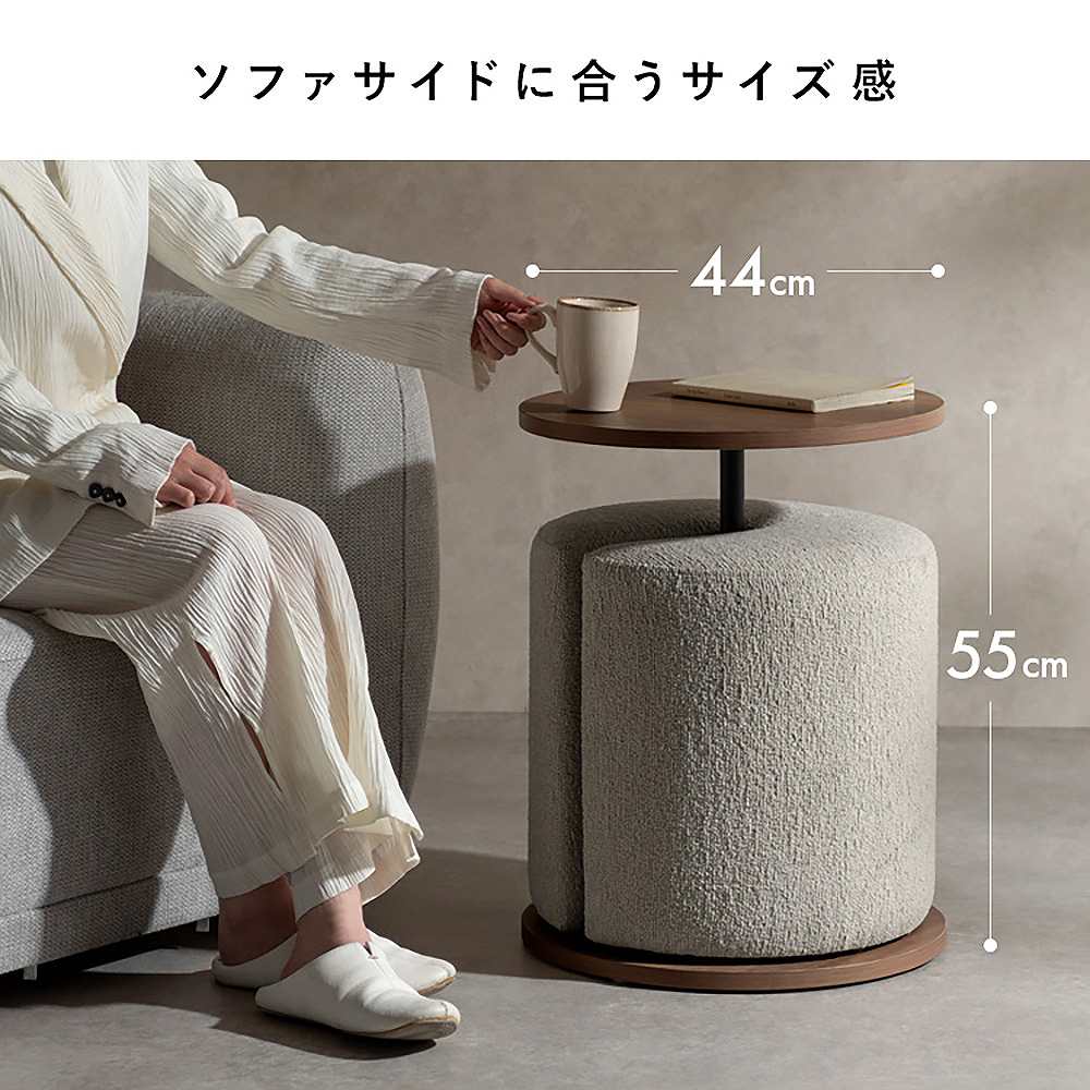 木目柄のラウンドサイドテーブルと天板下に収納できるスリット付きのスツールがセットになった『Lien(リエン)』。必要なときにサッと取り出せるスツールは来客時などに便利にお使いいただけます。カラーはナチュラルとブラウンの2カラーからお部屋の雰囲気やお好みでお選びいただけます。製品重量:11.9kg 組立式(約15分)