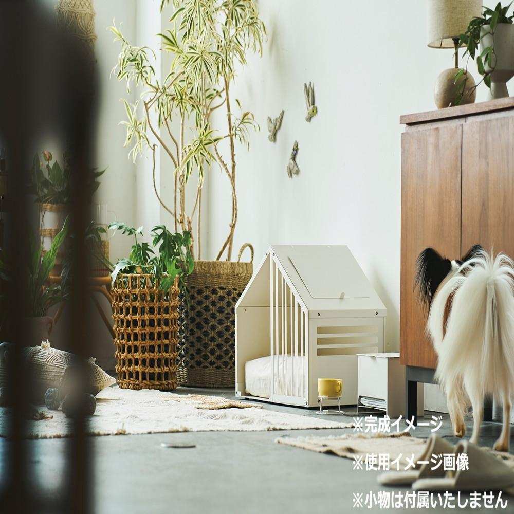 インテリアに馴染む ペットハウスの出入口は、軽く頭を下げて身をかがめると入れる高さが目安です。空間は横たわっても手足を伸ばせる広さ、天井高は立ち上がっても頭がぶつからず、体の向きを変えるものが良いとされています。正面の装飾壁は左右どちらでもお好きな側に取り付けできます。正面の装飾壁無しで開放的に使用してもOKです。通気用スリットも左右お好きな側に取り付けできます。※商品は手作りの為、塗装や形状に多少のばらつきがございます。ご了承ください。※こちらは組立商品です。外壁材にも使用されるガルバリウム鋼板製で、布製のようにへたることなく長くお使いいただけます。汚れや匂いがつきにくく、お手入れも簡単で衛生的です。通気性をよくするためのスリット付です。コードを噛むなどの事故から守るコード穴が付いています。パピーやシニア犬、怖がりな子でも段差をできる限りなくし、安心して出入りできる設計です。仕様:組立式、お手入れ簡単、ワイドな間口(段差が少ない)、コード穴付き、通気性スリット付き