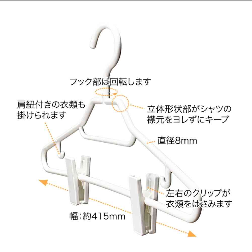 洋服の襟をしっかりキープする形状クリップでボトムも収納できる