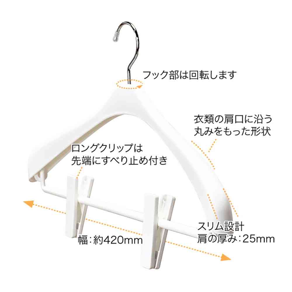 スリムタイプで収納効率が良いボトムスをしっかり挟むロングクリップ