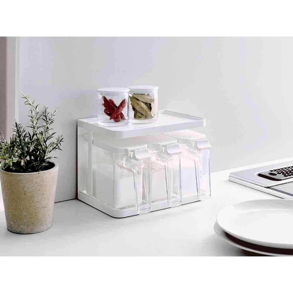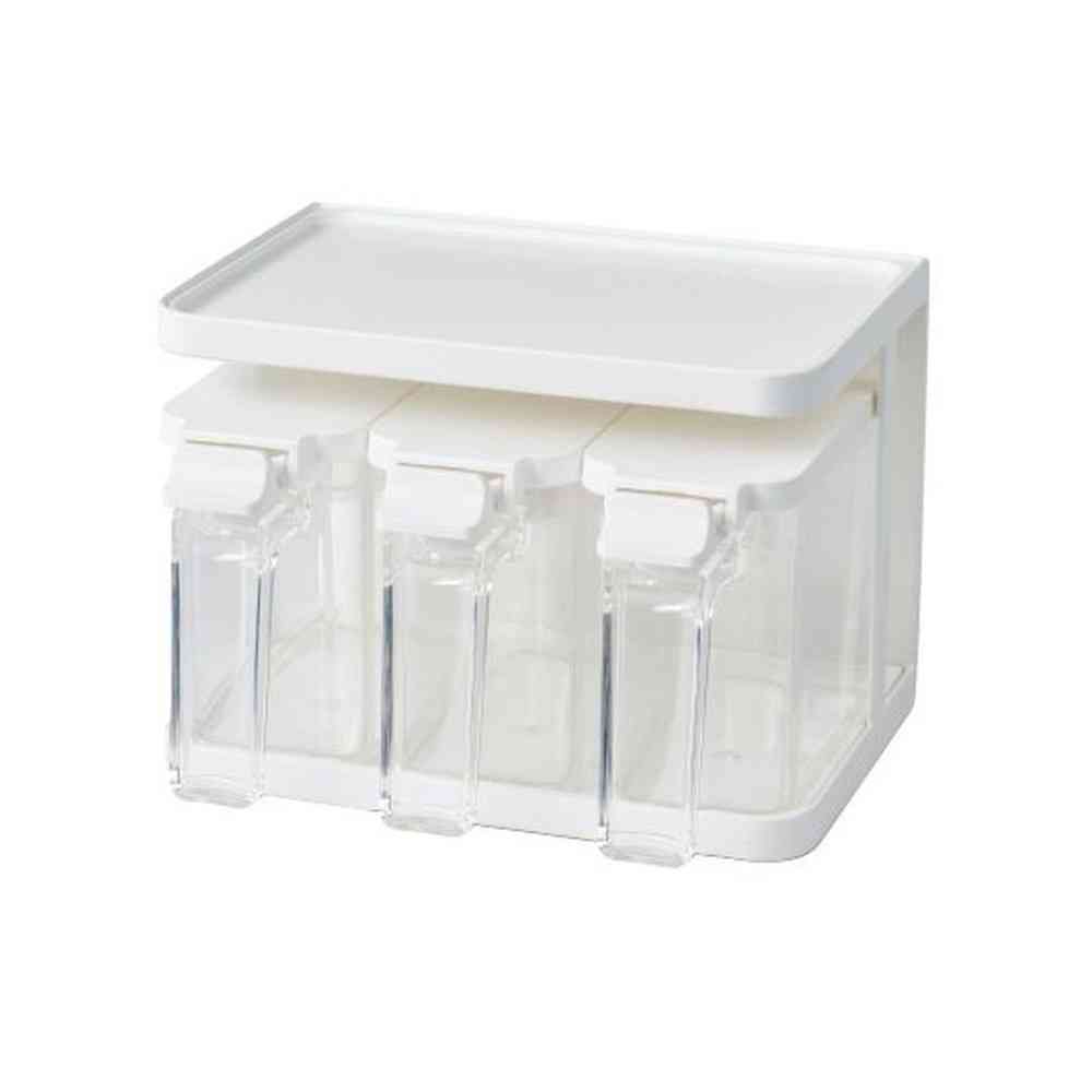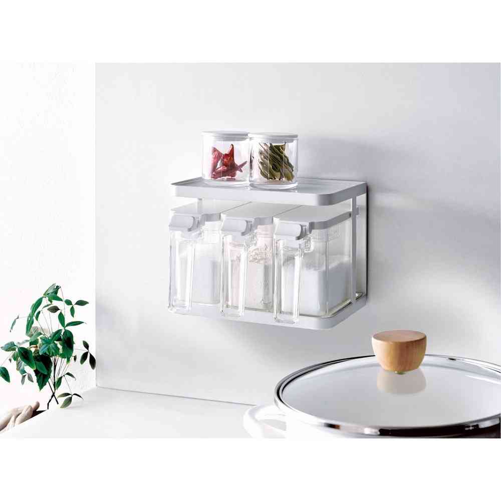 ラックの背面にマグネットがついた調味料ラックと、そこにピッタリ収まる密閉調味料ポット(450ml)が3個ついたセットです。