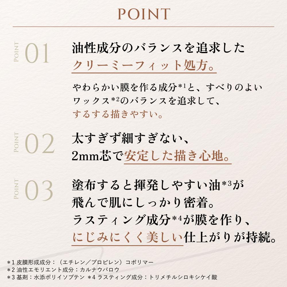 ●【するする描けるクリーミーフィット処方】やわらかい膜を作る成分※1と、すべりのよいワックス※2のバランスを追求した、するする描きやすいジェルアイライナーです。(※1 皮膜形成成分:(エチレン/プロピレン)コポリマー ※2 油性エモリエント成分:カルナウバロウ)
