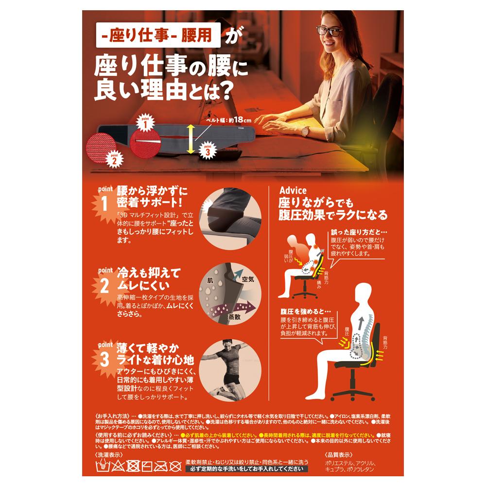 ●The 3D multi-fit design (design registration applied) [design registration No. 1427207] suppresses floating on the back by switching the elastic strength of the slit in the center of the belt and the rubber. A waist supporter that firmly supports the waist and achieves a three-dimensional fit.
