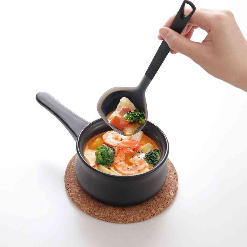 小鍋ですくいやすく、卓上でのとりわけにも使えるコンパクトサイズ握ることを追求した「三角断面グリップ」が手によくフィットするキッチンツールです。