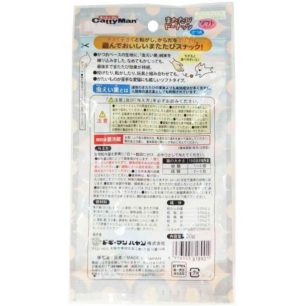 ●旨味たっぷりのかつおベースの生地に「虫えい果」純末を練り込んでいるので、なめてもかじってもまたたび効果が最後まで持続します。